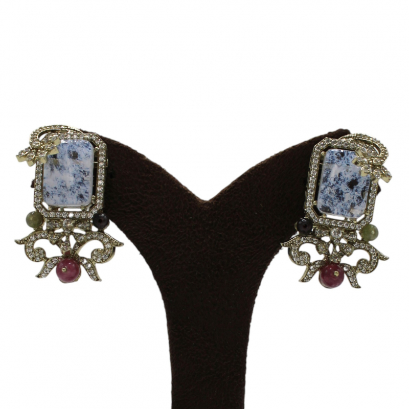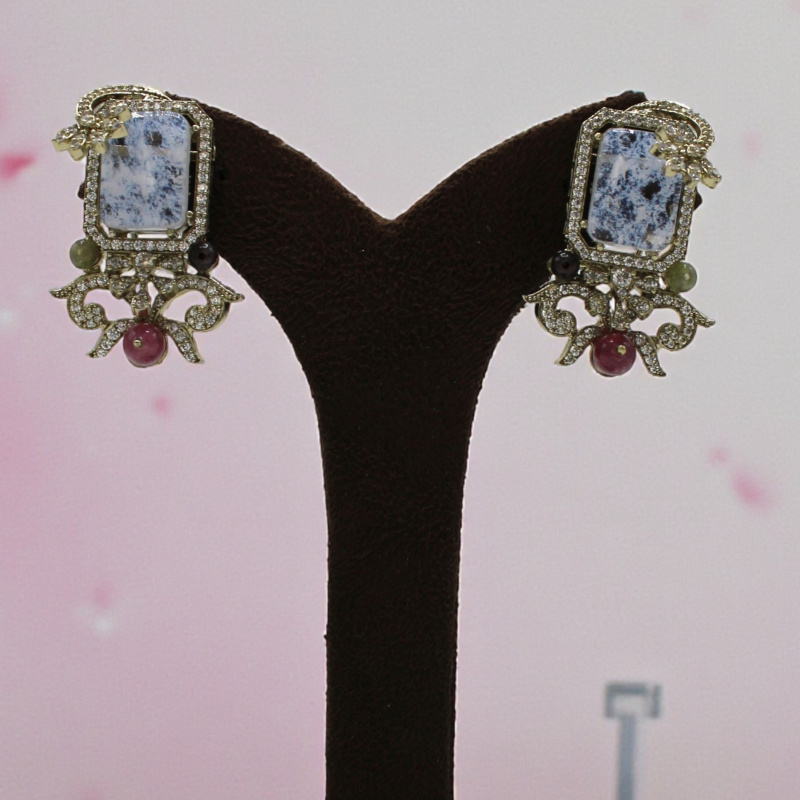 Make a bold yet graceful statement with these designer drop earrings featuring a rectangular blue marble-textured stone set in an antique gold frame. Accented with shimmering micro stones and delicate bead drops, these earrings blend contemporary charm with artistic detailing, making them perfect for festive wear, parties, and special occasions.