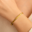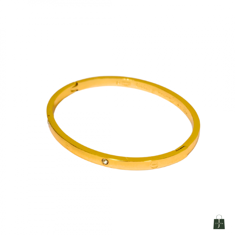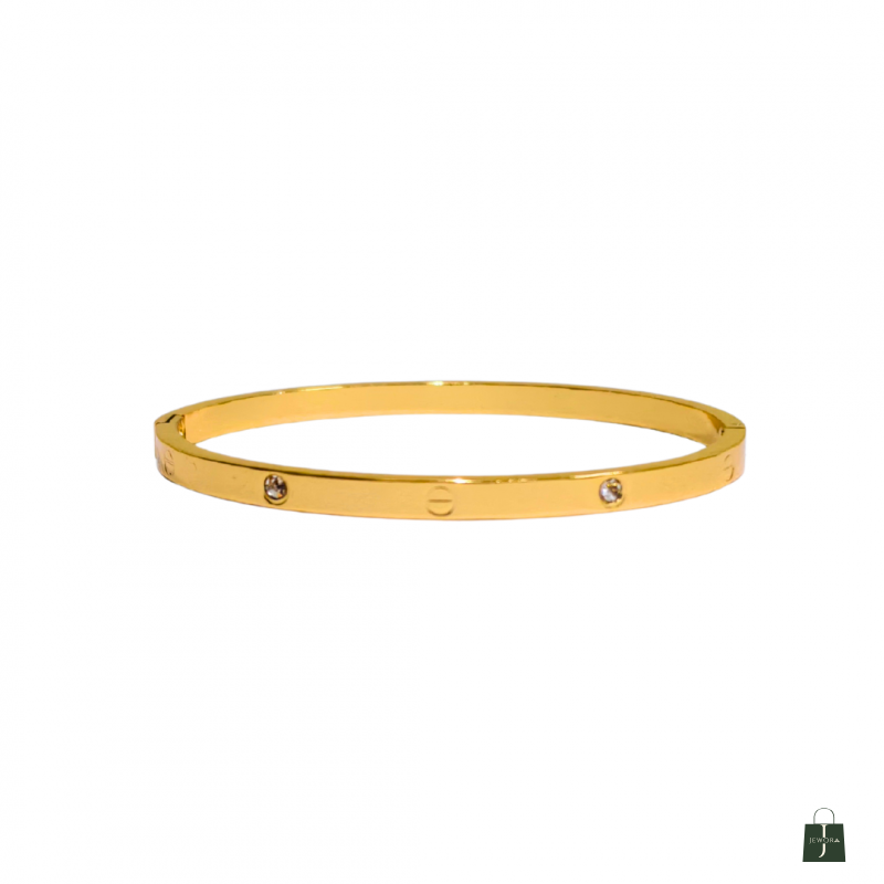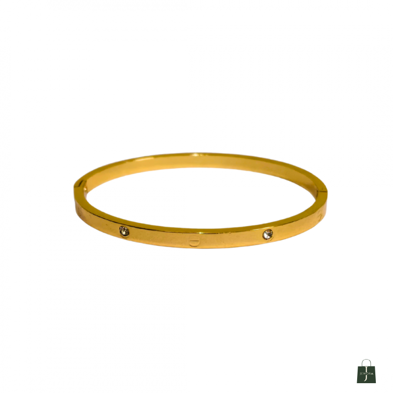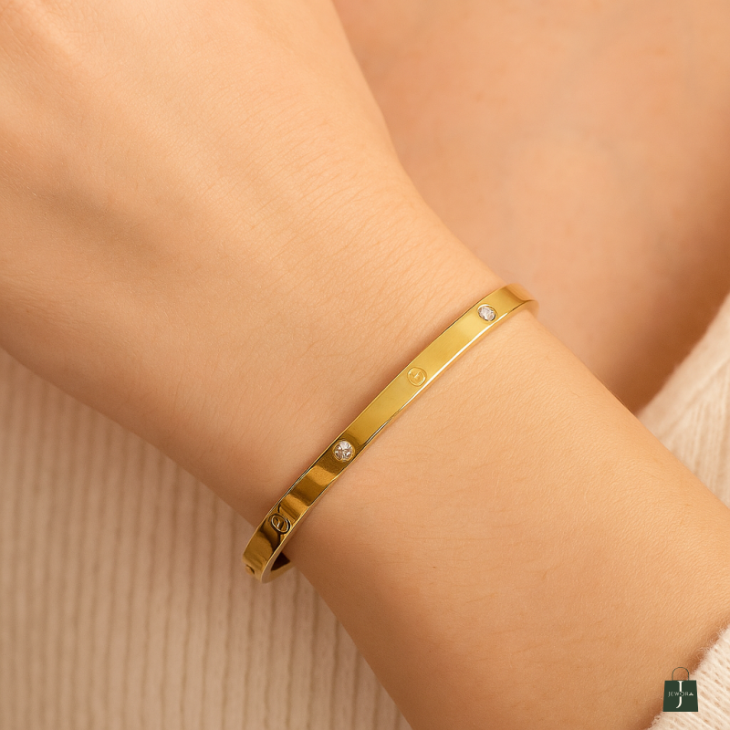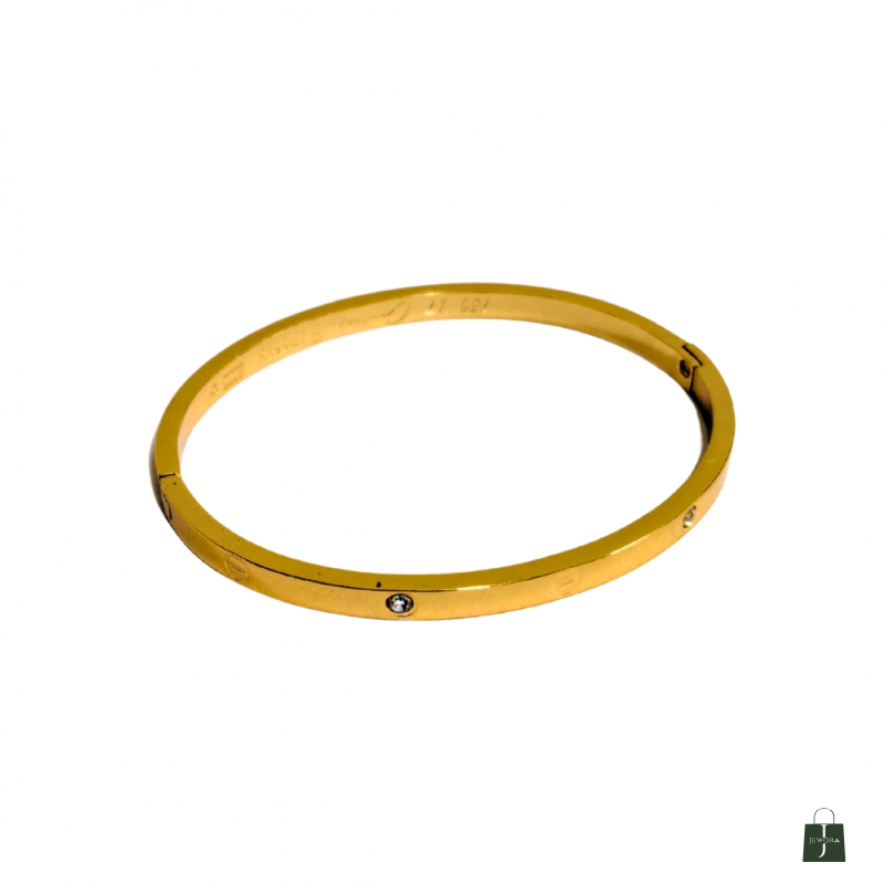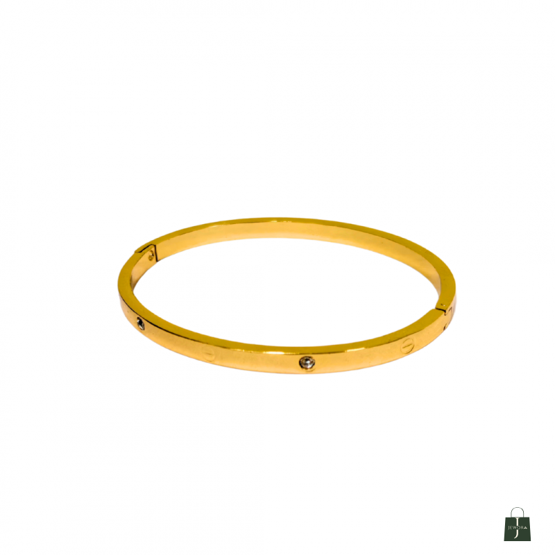 Luxurious and refined, this gold plated bangle bracelet for women features a sleek circular design with screw motifs and sparkling stones. Its polished surface and symmetrical accents offer timeless elegance. Crafted from 18k plated stainless steel and cubic zirconia, it is skin-safe, waterproof, and anti-tarnish—a sophisticated piece that elevates any look.