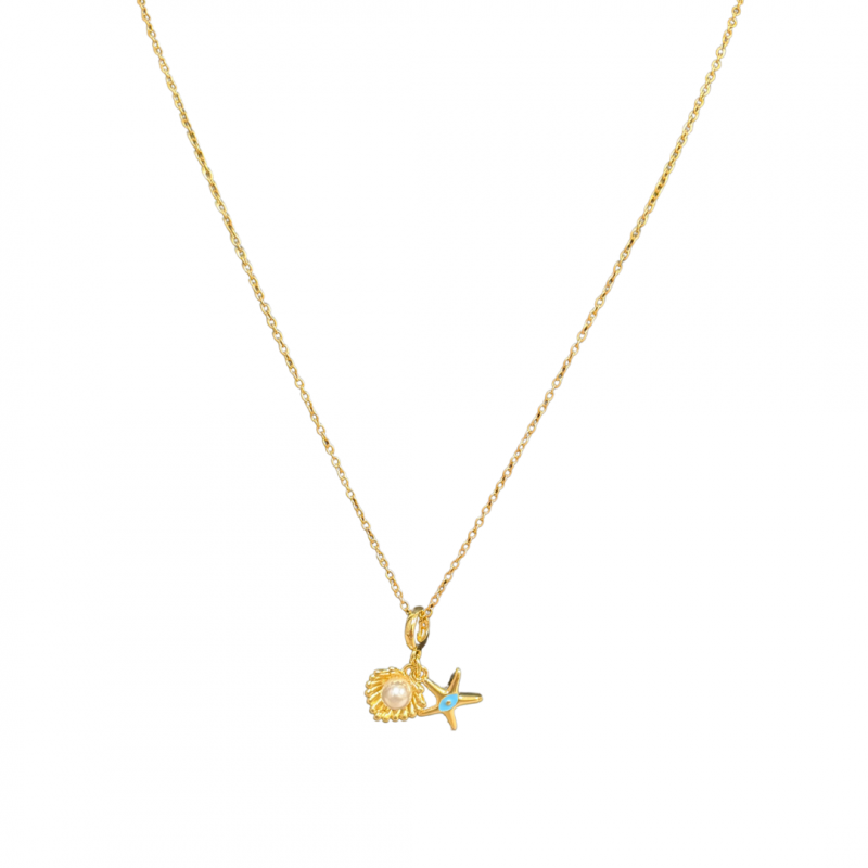 Inspired by the sea, this gold plated necklace for women features a charming pendant with a pearl-set shell and a starfish accent. The turquoise detail adds a pop of color, making it perfect for summer styling or gifting. Crafted from 18k plated stainless steel, imitation pearl, and enamel, it is skin-safe, waterproof, and anti-tarnish—a playful yet elegant piece for everyday wear.