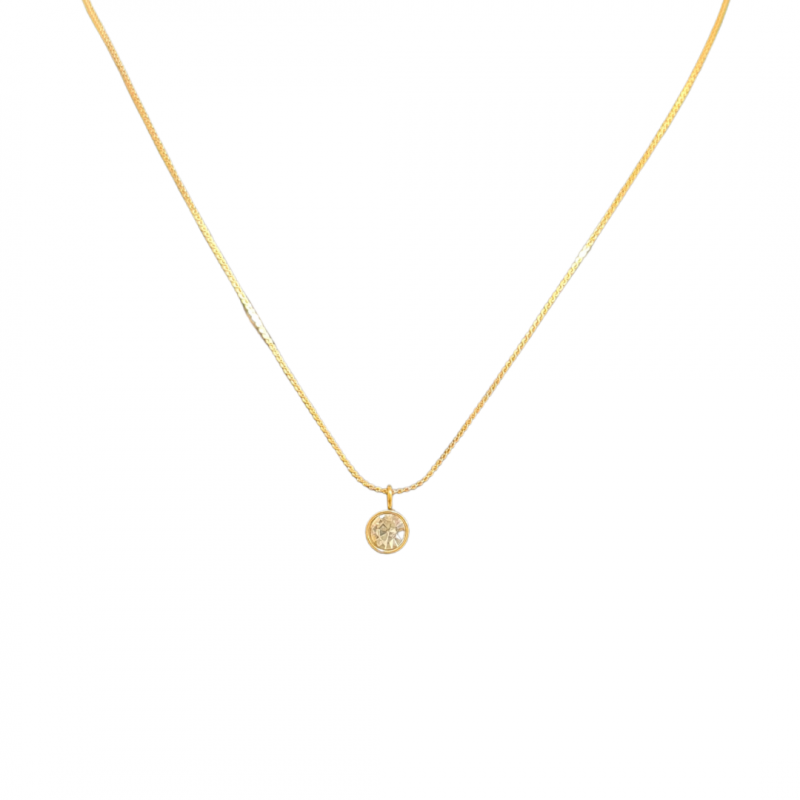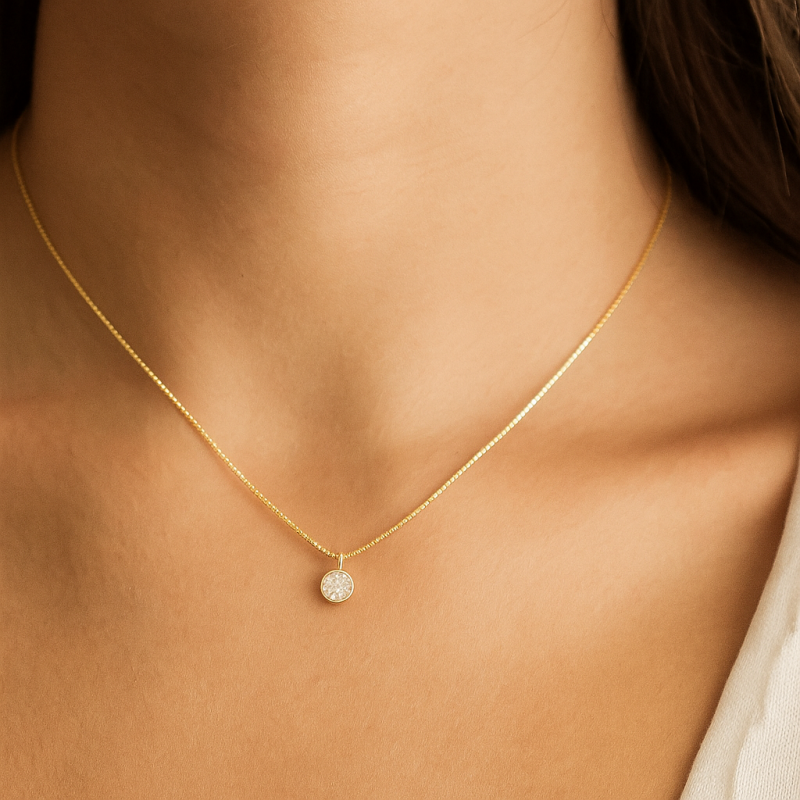 Delicate and refined, this gold plated necklace for women features a single round stone pendant in a smooth gold setting. Its clean design and subtle shine make it perfect for layering or wearing solo. Crafted from 18k plated stainless steel and cubic zirconia, it is skin-safe, waterproof, and anti-tarnish—a graceful addition to your everyday jewellery.