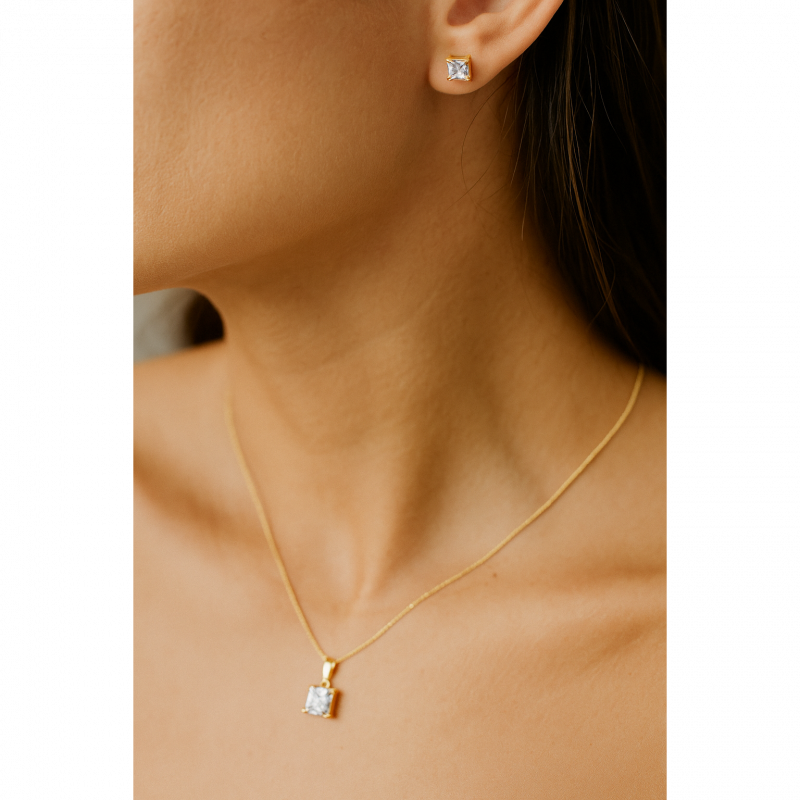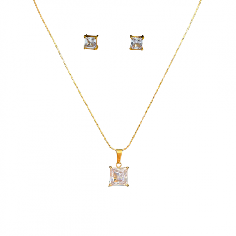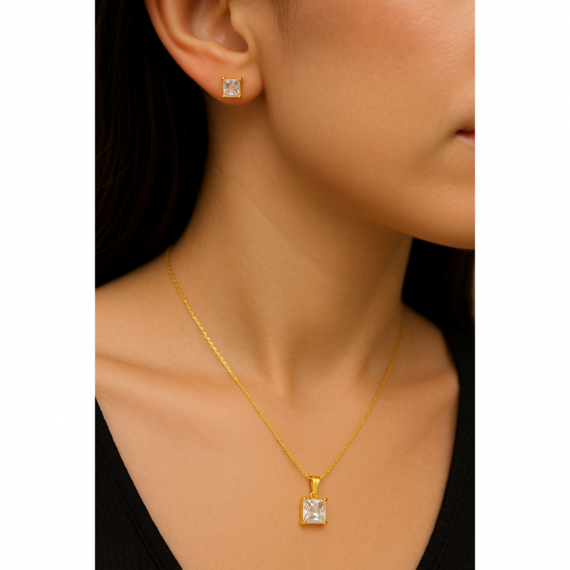Elegant and coordinated, this gold plated necklace and earring set for women features square-cut stones in a clean, classic design. The pendant and matching studs offer a balanced sparkle, perfect for everyday wear or special occasions. Crafted from 18k plated stainless steel and cubic zirconia, the set is skin-safe, waterproof, and anti-tarnish—a graceful addition to your jewellery collection.