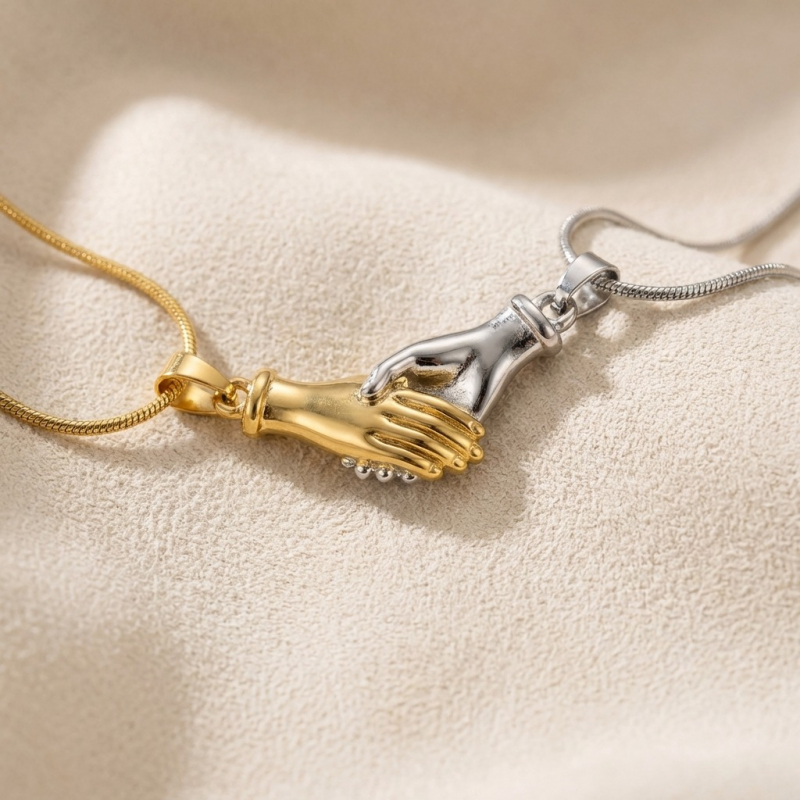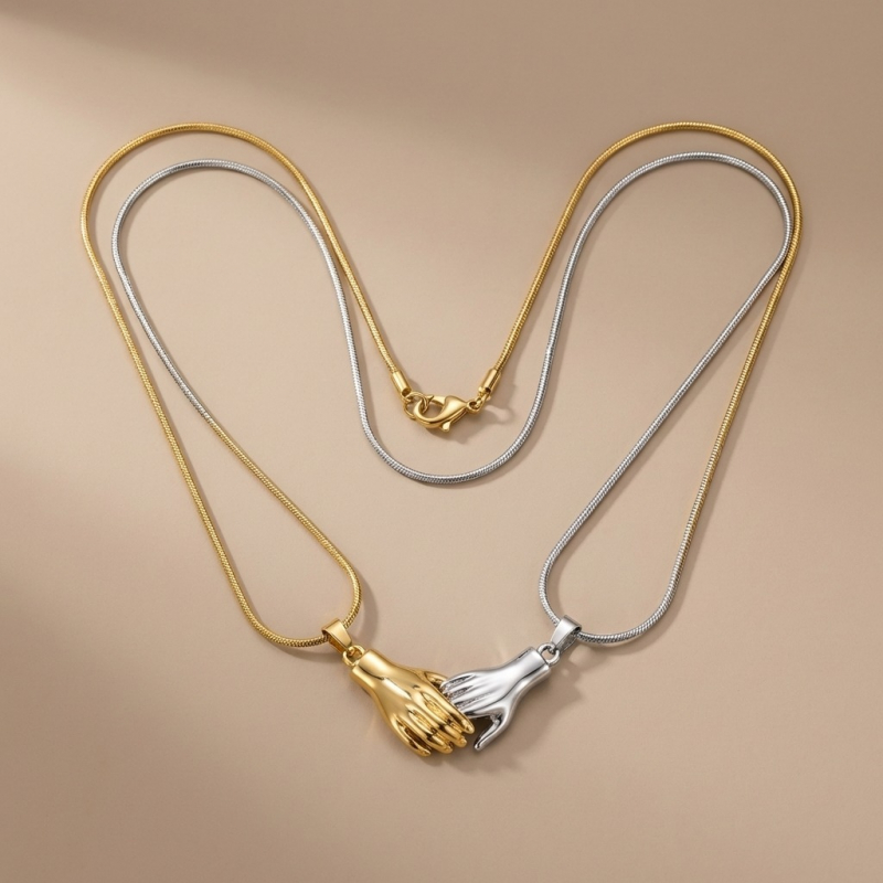 The Concept: The set consists of two individual necklaces with hand-shaped pendants. These pendants are equipped with internal magnets, allowing the hands to "clasp" together when they are in close proximity.
