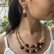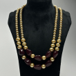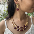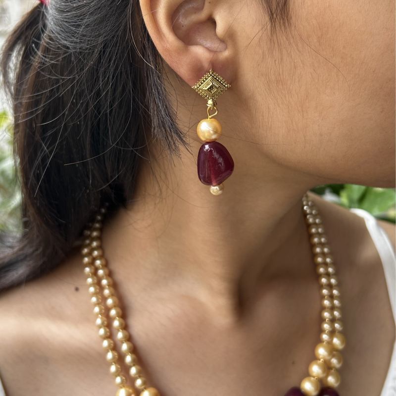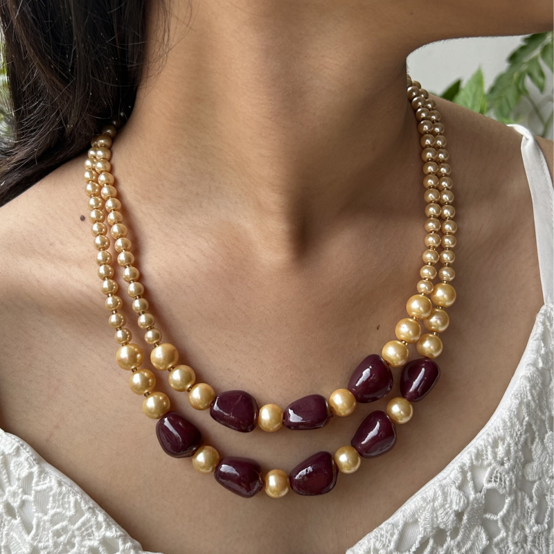 Bhavdiya’s cream and mehroon double-layer pearl necklace blends modern artistry with traditional charm. Featuring a unique mix of round and triangular pearls, it creates a rich, statement look. Enhanced with a high-shine finish and a gold-polished lock, this elegant piece is perfect for weddings, festive outfits, and premium gifting.