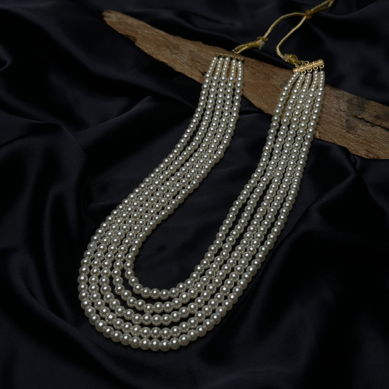 This elegant jewellery set features a beautifully layered five-strand necklace crafted with lustrous white pearls that create a graceful and luxurious look. The finely arranged pearl strands sit perfectly around the neckline, offering a timeless and sophisticated style. The set is paired with delicate floral pearl stud earrings that complement the necklace perfectly. Ideal for weddings, festive celebrations, parties, or elegant evening wear.