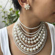 Bhavdiya’s 9-string white pearl necklace showcases regal craftsmanship with its luxurious multi-layer design. Made from mixed-size round pearls and enhanced with a 9-layer high-shine coating, it delivers unmatched brilliance. Secured with a gold-polished lock, this exquisite piece is perfect for weddings, festive occasions, and elegant celebration looks.