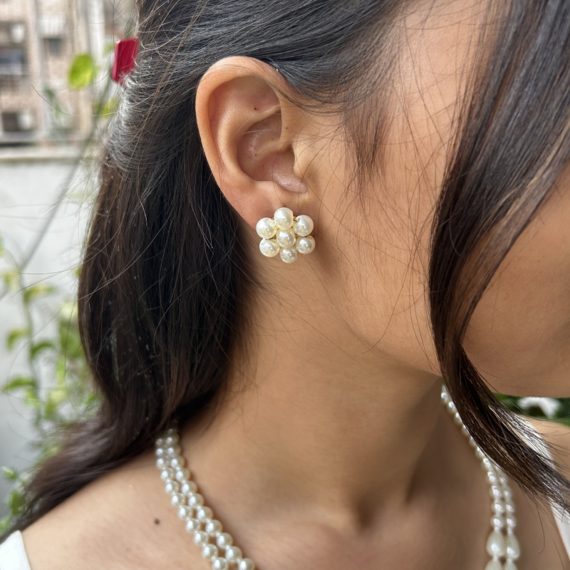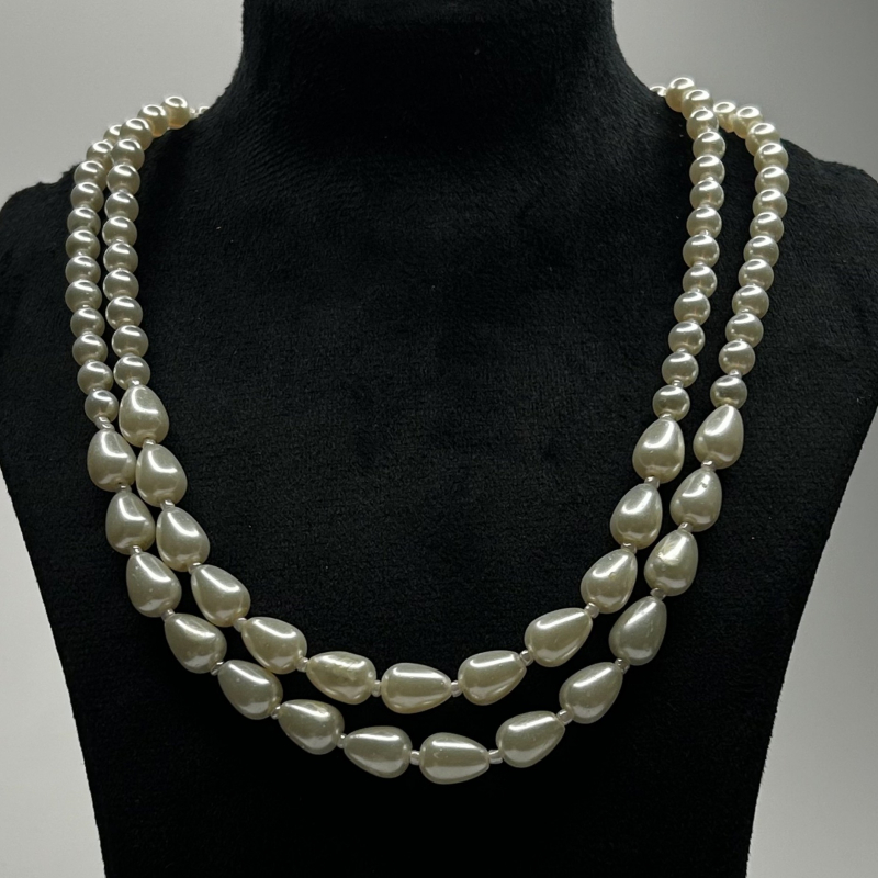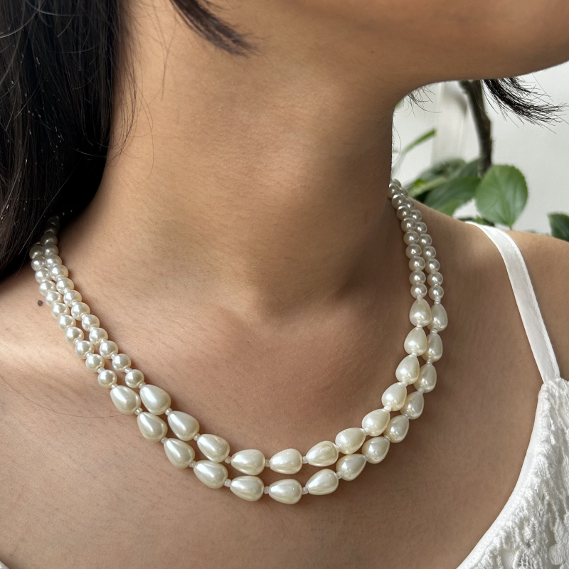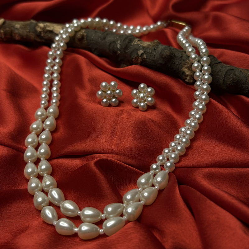 Bhavdiya’s double-layer white pearl necklace combines tear-drop and round pearls for a beautifully textured finish. The mix of 2 mm and 3 mm pearls creates a soft, elegant flow that enhances any outfit. With a high-shine coating and gold-polished clasp, this piece is ideal for celebrations, gifting, and graceful styling.