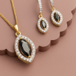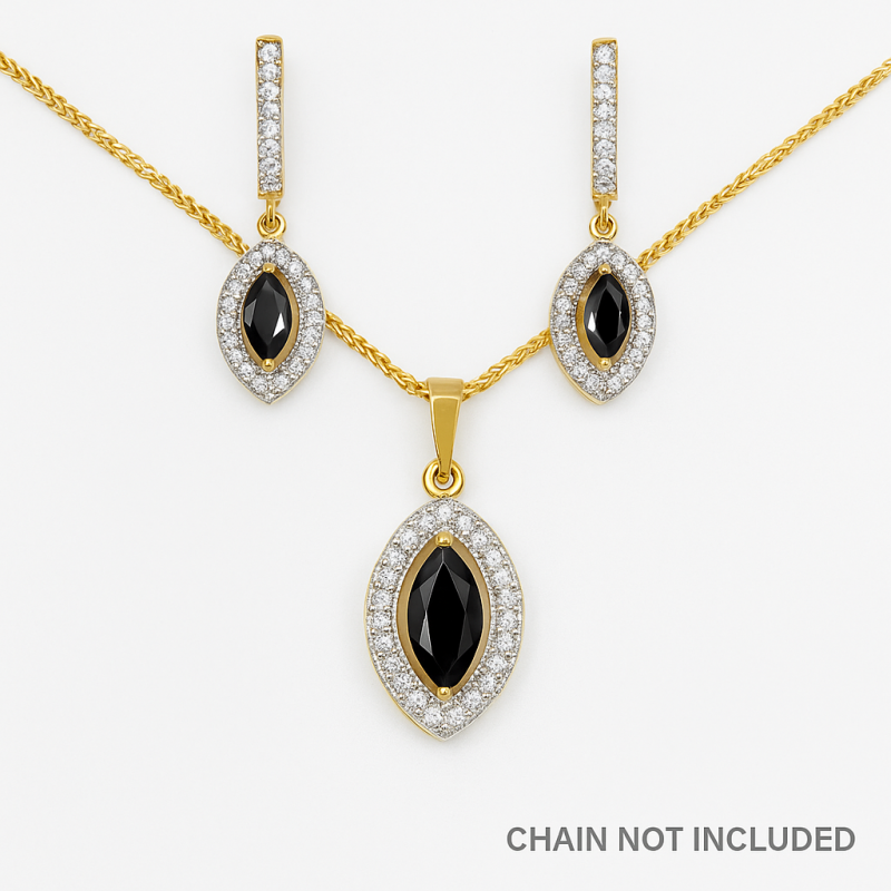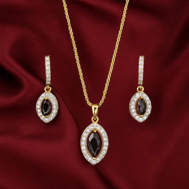 Elevate your style with this Black Onyx Pendant Set, a perfect blend of modern elegance and classic charm. The pendant and matching earrings feature a striking marquise-cut black onyx stone, framed with dazzling American Diamonds (CZ) for a bold contrast. Crafted on a high-quality alloy base with a lustrous gold and silver finish, this set is ideal for parties, festive gatherings, or evening wear. Its sleek design makes it versatile enough to pair with both traditional and western outfits, making it a must-have addition to your jewellery collection.