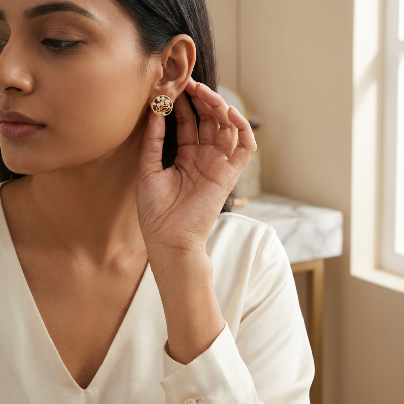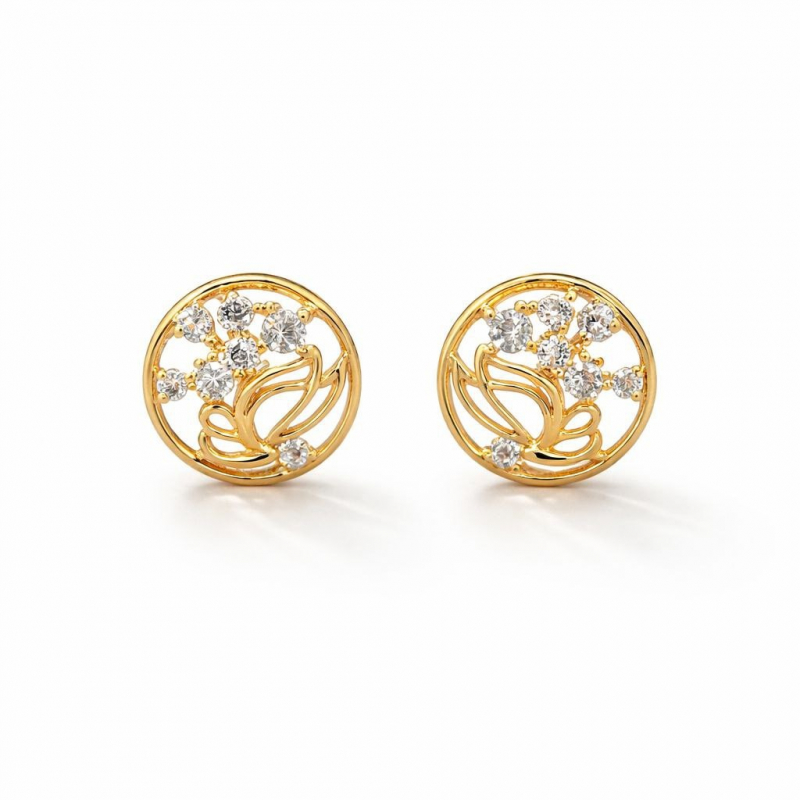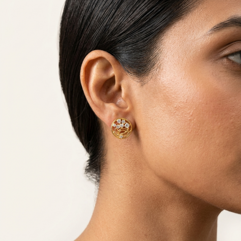 Inspired by cherry blossoms in full bloom, these delicate circular stud earrings feature a botanical tree motif set within an open-work gold frame. Seven sparkling round-cut diamonds catch the light from every angle, making these the perfect everyday luxury piece.