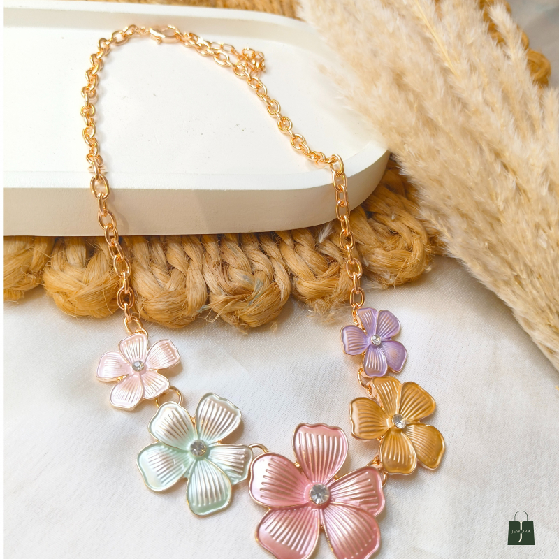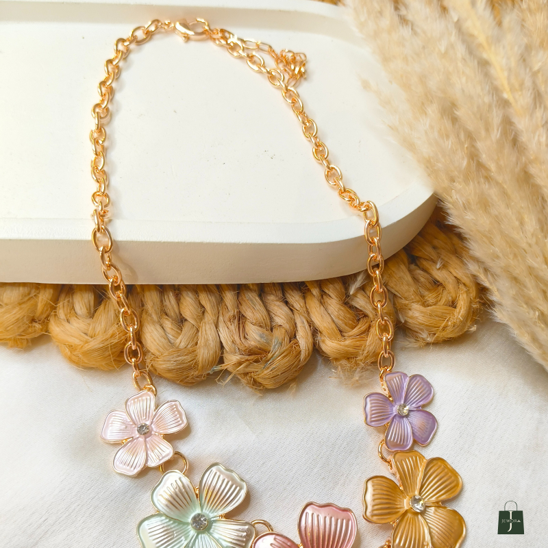 The Bloomette Pastel Floral Necklace is a delightful statement piece inspired by blooming spring flowers. Designed with a glossy gold-toned chain and adorned with beautifully detailed enamel floral motifs, this necklace features a harmonious blend of soft pastel shades that instantly brighten any outfit.