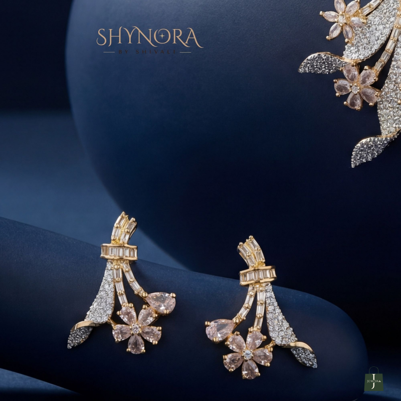 The matching earrings echo the same floral cascade pattern, creating a harmonious and luxurious set that feels light yet statement-worthy. This design beautifully balances sparkle with softness, making it timeless and versatile.
