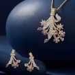 The Blossom Cascade Diamond Pendant Set is a graceful celebration of floral elegance and flowing design. Crafted with delicate flower motifs, the pendant features cascading crystal-studded stems accented with champagne-toned marquise petals and shimmering white pavé leaves. The soft movement and organic form give it a refined, feminine charm.