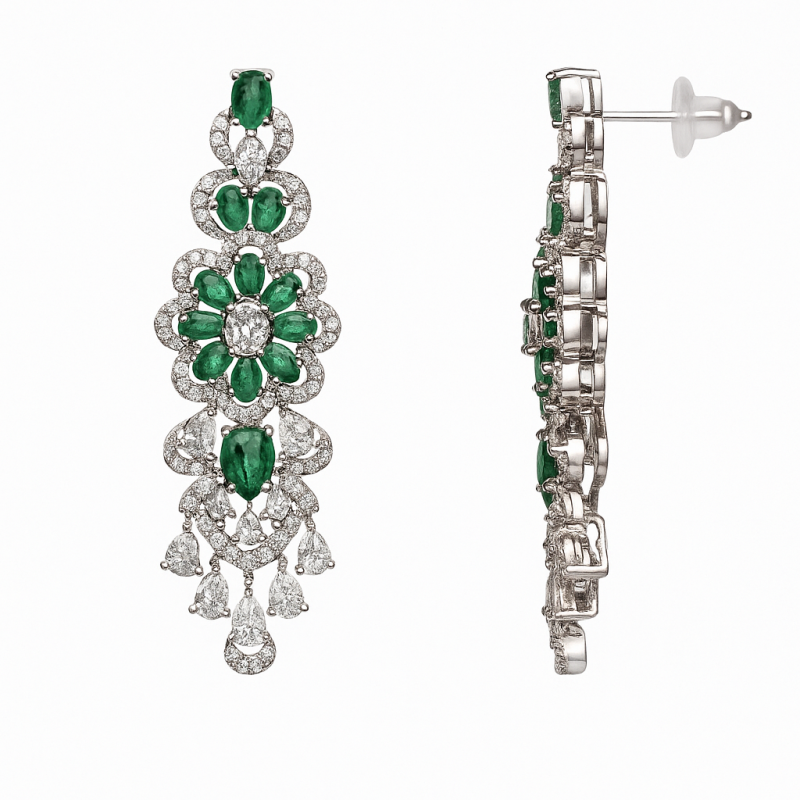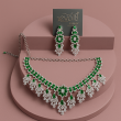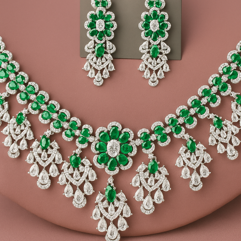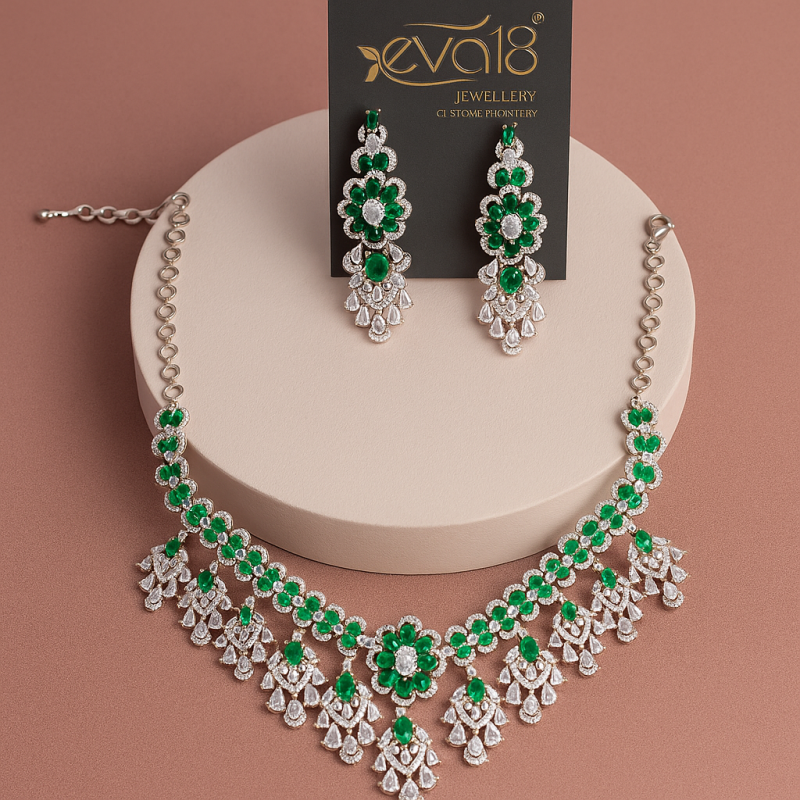 Unveil the elegance of timeless luxury with the *Blossom Cascade Necklace Set*. Crafted with shimmering American Diamonds and lush emerald-green stones, this design radiates sophistication. The necklace features a graceful floral centerpiece with intricate stone-studded patterns, complemented by cascading layers of green and white brilliance that flow like a garden in bloom. The matching earrings, adorned with emerald floral motifs and sparkling drops, complete the regal look. Perfect for festive occasions, evening parties, and bridal celebrations, this set embodies charm and opulence. Its detailed craftsmanship and premium finish make it a must-have for jewelry lovers seeking elegance with a touch of nature’s freshness. Designed for modern women with a classic taste, this piece effortlessly combines glamour and grace, ensuring you shine on every occasion.