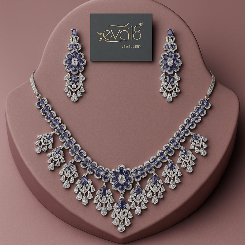 Unveil the elegance of timeless luxury with the *Blossom Cascade Necklace Set*. Crafted with shimmering American Diamonds and lush emerald-green stones, this design radiates sophistication. The necklace features a graceful floral centerpiece with intricate stone-studded patterns, complemented by cascading layers of green and white brilliance that flow like a garden in bloom. The matching earrings, adorned with emerald floral motifs and sparkling drops, complete the regal look. Perfect for festive occasions, evening parties, and bridal celebrations, this set embodies charm and opulence. Its detailed craftsmanship and premium finish make it a must-have for jewelry lovers seeking elegance with a touch of nature’s freshness. Designed for modern women with a classic taste, this piece effortlessly combines glamour and grace, ensuring you shine on every occasion.