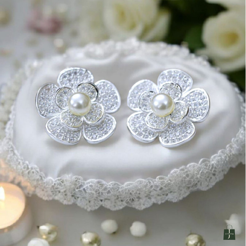 Embrace timeless beauty with Blossom Elegance, a striking pair of earrings that bloom with grace. Each petal sparkles with intricate white stones, surrounding a luminous central pearl for a truly sophisticated statement. Ideal for weddings, festive occasions, or adding a floral flair to your evening attire.