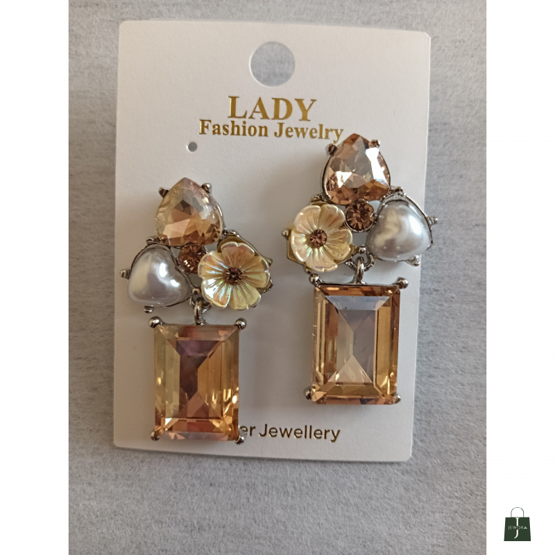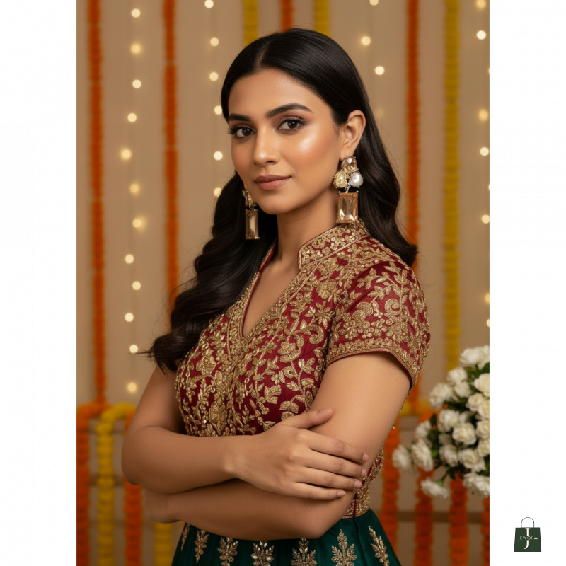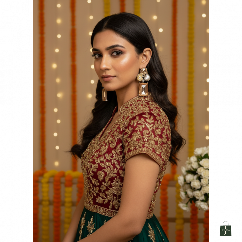 These elegant statement earrings feature a striking combination of deep emerald-green faceted stones and delicate floral accents. The design highlights a bold rectangular emerald-cut drop that adds length and sophistication, beautifully balanced by a heart-shaped pearl centerpiece for a soft, romantic touch. A translucent green flower motif and smaller crystal details complete the look, all set in a polished silver-tone frame. Perfect for festive occasions, parties, and evening wear, these earrings bring a luxurious charm and refined sparkle to any outfit.