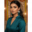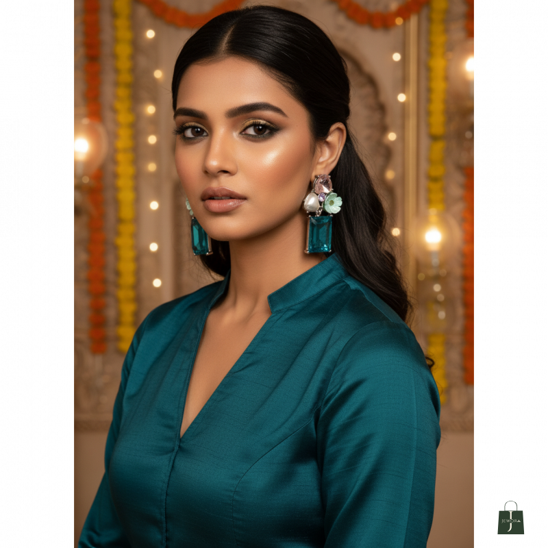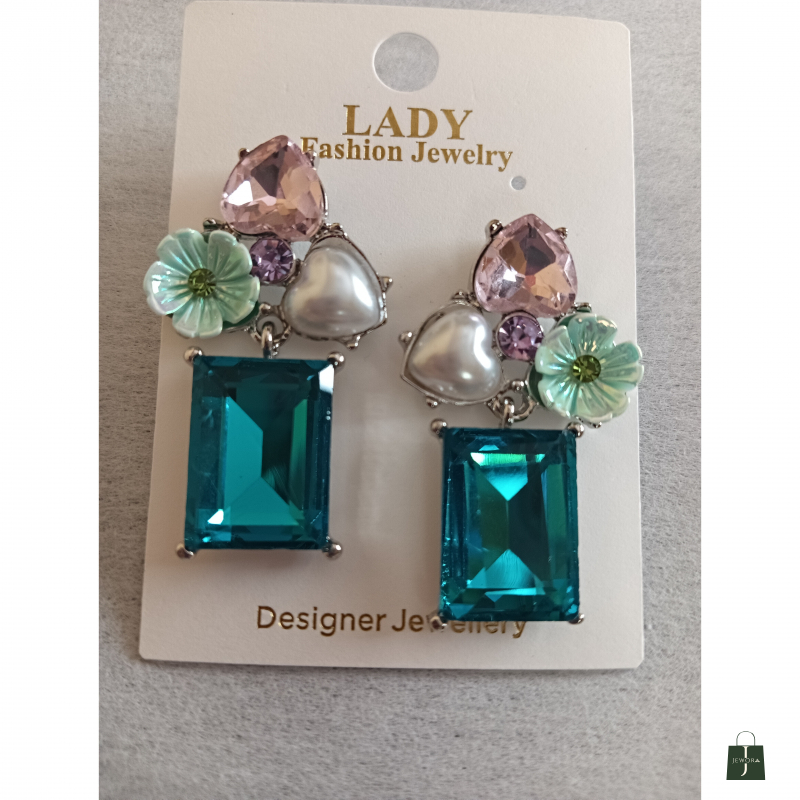 These elegant statement earrings feature a striking combination of deep emerald-green faceted stones and delicate floral accents. The design highlights a bold rectangular emerald-cut drop that adds length and sophistication, beautifully balanced by a heart-shaped pearl centerpiece for a soft, romantic touch. A translucent green flower motif and smaller crystal details complete the look, all set in a polished silver-tone frame. Perfect for festive occasions, parties, and evening wear, these earrings bring a luxurious charm and refined sparkle to any outfit.