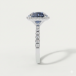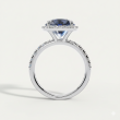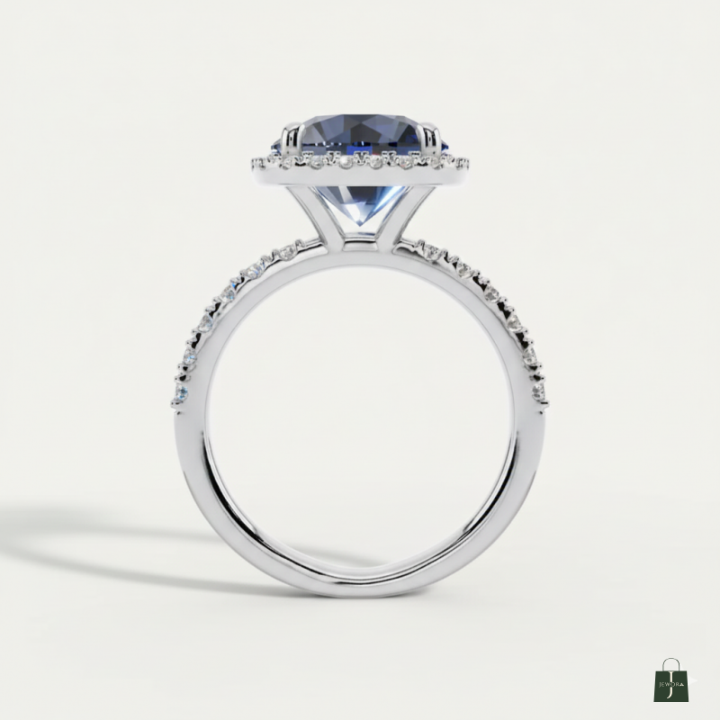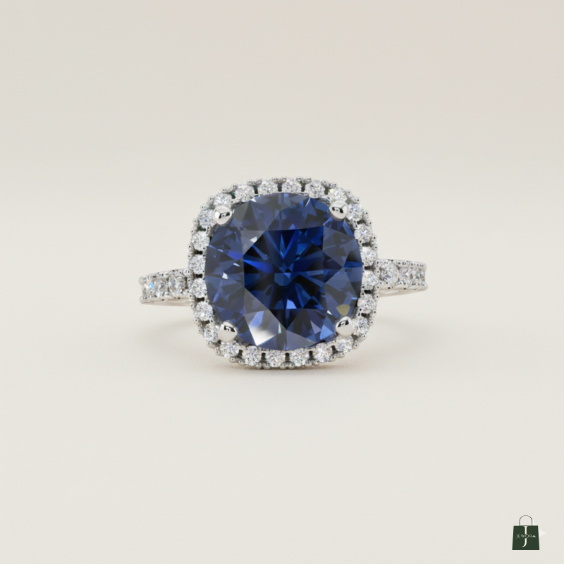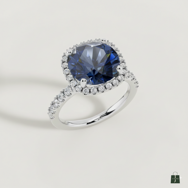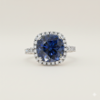 A luxurious cushion-cut deep blue gemstone ring. Features a brilliant halo setting and pave-detailed shoulders. An elegant statement piece for any occasion.