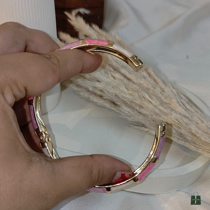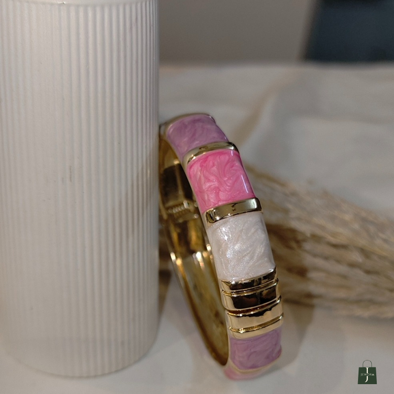 The Blush Aura Pastel Enamel Bangle is a modern statement accessory crafted with a sleek gold-toned base and beautifully finished pastel enamel segments. Featuring a harmonious blend of blush pink, pearl white, and lavender tones, this bangle adds a fresh, feminine charm to any outfit. The smooth glossy enamel surface gives it a luxurious look, while the structured bangle design makes it easy to wear solo or stack with other bracelets.