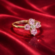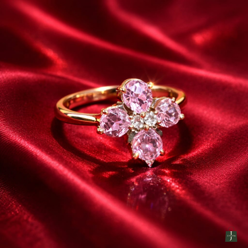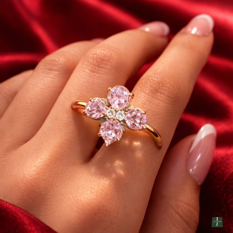 A delicate floral-inspired ring featuring four blush pink pear-cut stones beautifully arranged around a sparkling center crystal. Set on a polished gold band and captured against luxurious red satin, this elegant piece radiates femininity, grace, and timeless charm. Perfect for festive wear, romantic evenings, or adding a soft sparkle to your everyday style. 💍✨