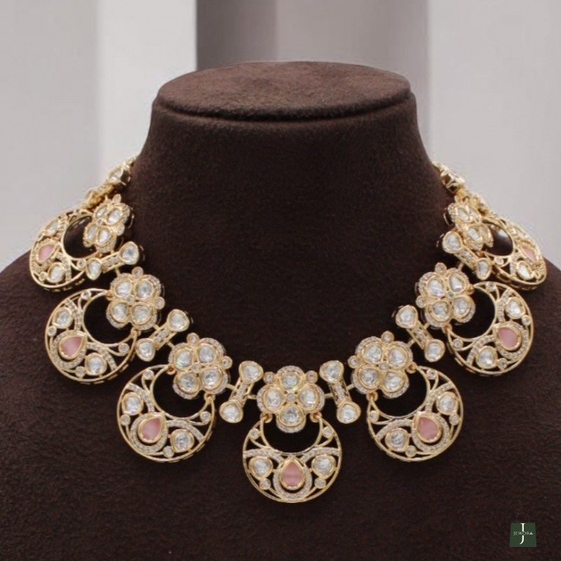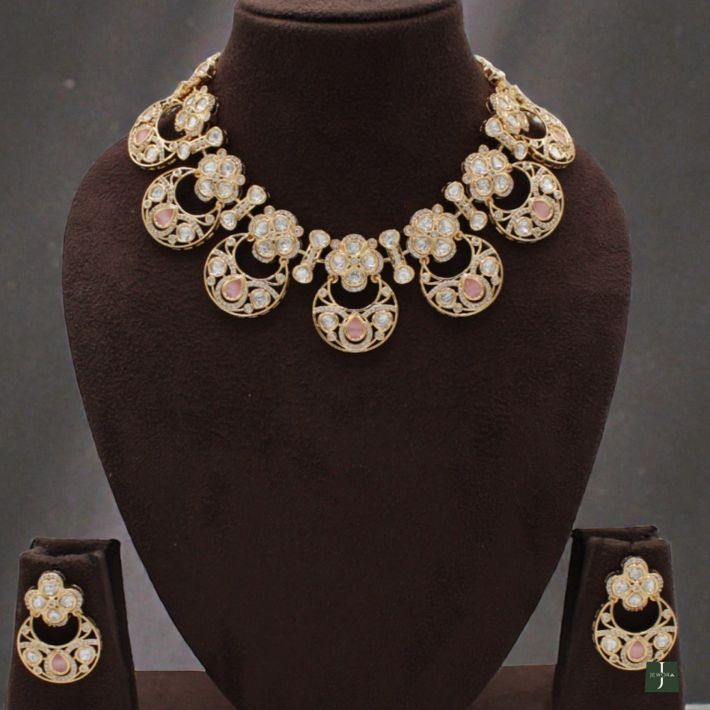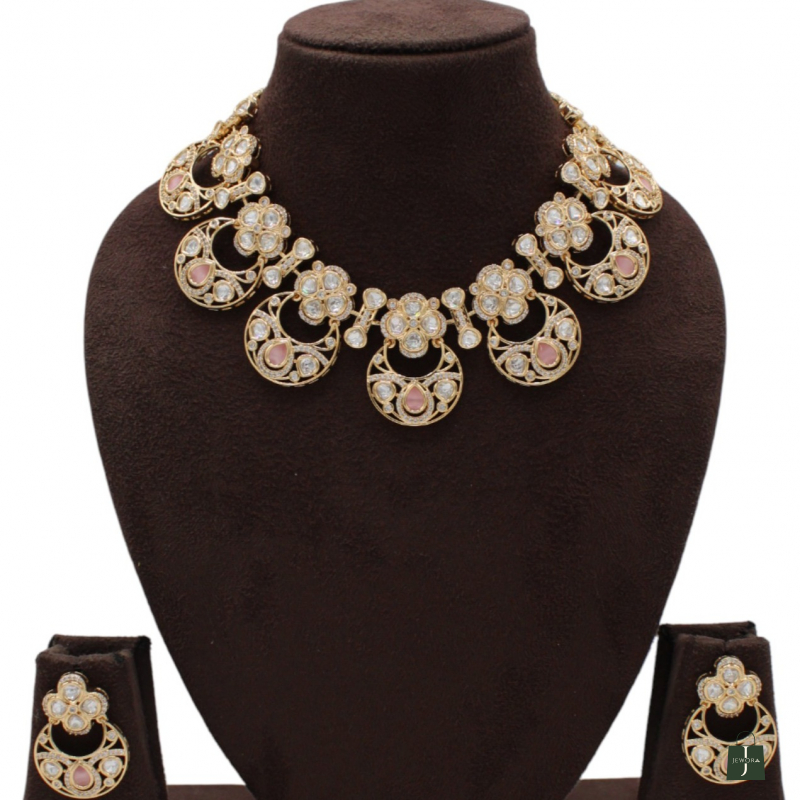 Add a touch of graceful charm to your ethnic look with this beautifully crafted statement necklace set. Designed with intricate floral motifs and crescent-shaped patterns, this piece features sparkling white Kundan stones highlighted with soft blush pink teardrop accents.