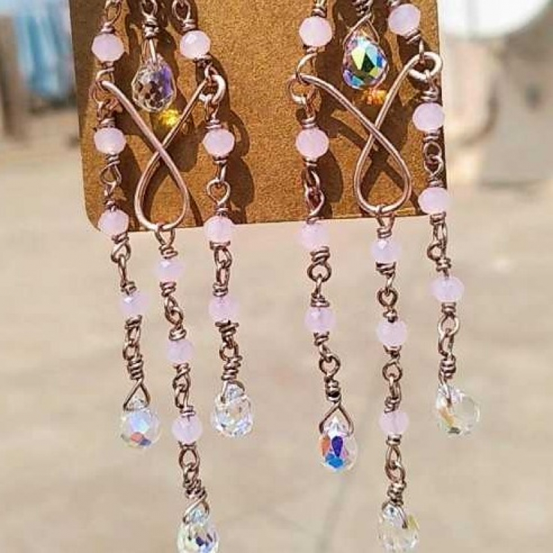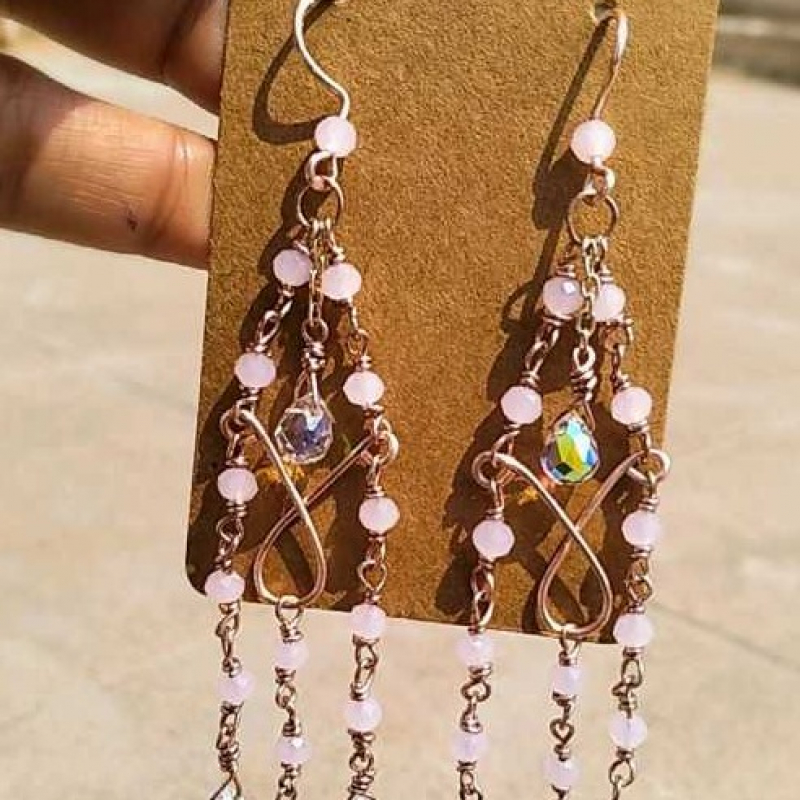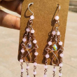 These earring are purely handcrafted using non tarnish wire which has copper base and polish on top to ensure its shine and logivity.We have used pink glass beads and fancy white beads to complete this beautiful piece.We recommand to avoid wearring while bathing&sleeping and store them separately to maintain its quality.