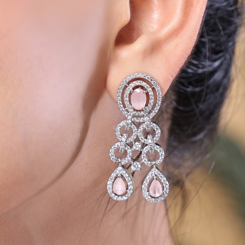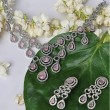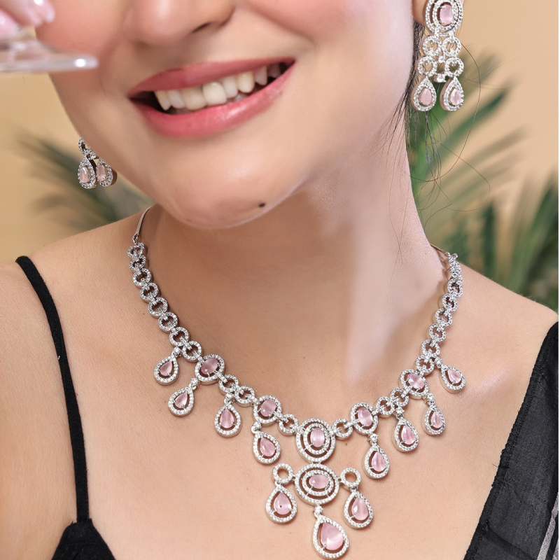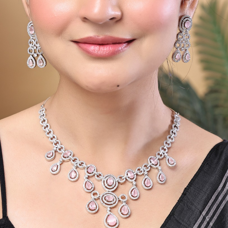 The Blush Frost Silver Necklace Set is a stunning statement piece that combines elegance with delicate charm. Featuring sparkling white diamond-like stones paired with soft pink accents, the necklace is crafted in a harmonious blend of circular and oval patterns, enhanced with intricate leaf motifs. Its two-layer design flows seamlessly, creating a radiant and graceful silhouette. The set includes matching drop earrings that add movement and sophistication. Finished in polished silver, the stones reflect light beautifully, creating a luminous effect. With a secure S-hook closure, this lightweight set is perfect for weddings, parties, and festive occasions, complementing both traditional and contemporary outfits with effortless style.