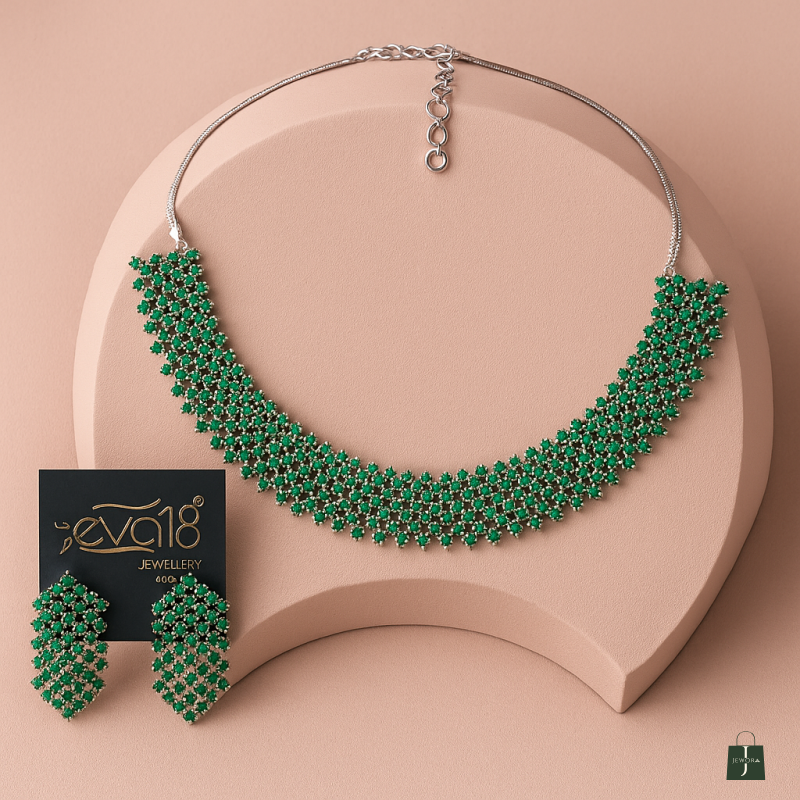 The Blush Lattice Silver Necklace Set showcases a refined web of tiny, closely-set stones arranged in a floral lattice pattern. Crafted on a durable alloy base with a sleek silver polish, the necklace drapes in a gentle curve, sparkling with rows of petite pink stones bordered by brilliant American Diamonds (CZ). Coordinated long earrings echo the same lattice motif, adding vertical elegance and movement. Lightweight yet striking, this set is perfect for party wear and festive gatherings, pairing seamlessly with sarees, lehengas, and contemporary outfits alike. Its meticulous stone setting and uniform finish deliver a premium, catalog-ready look while remaining comfortable for extended wear. Elevate your ensemble with this graceful blend of color, shine, and craftsmanship.