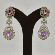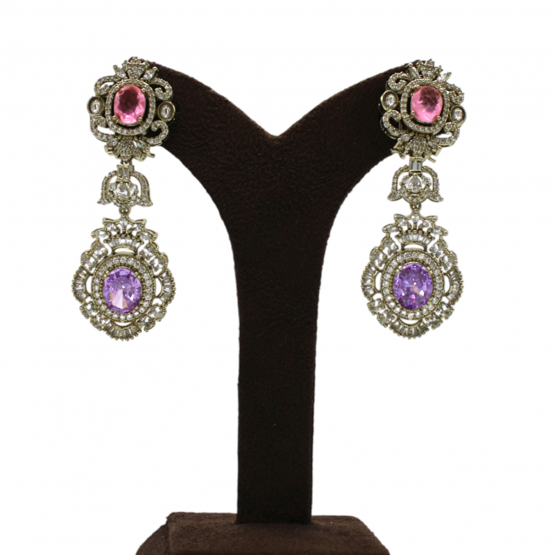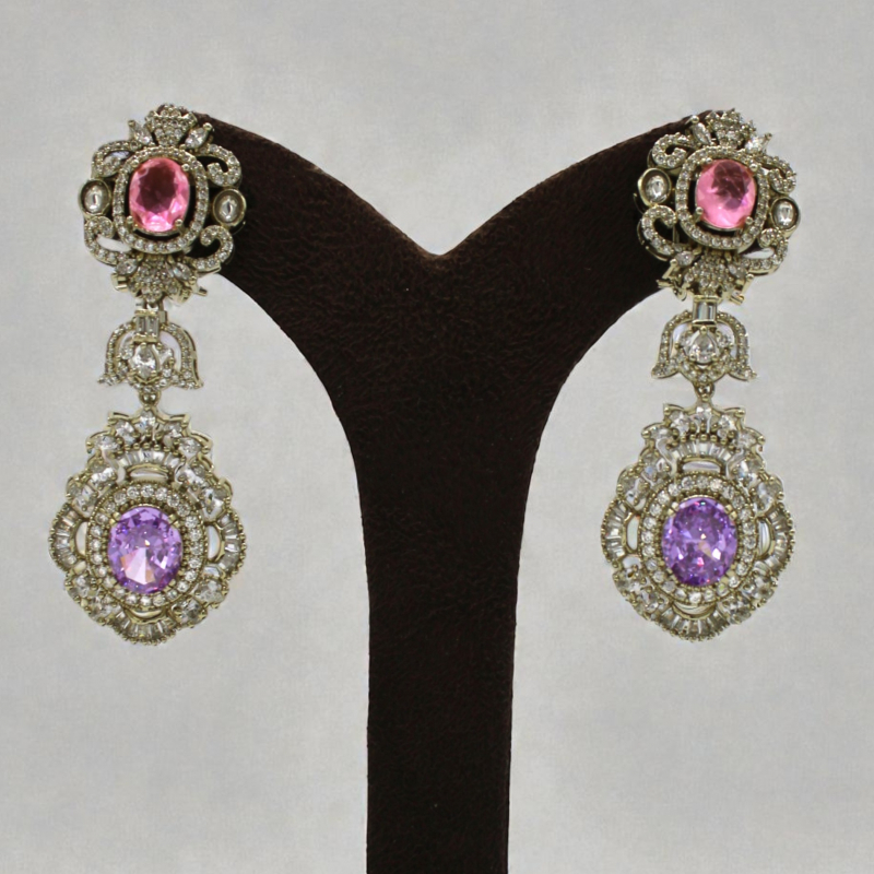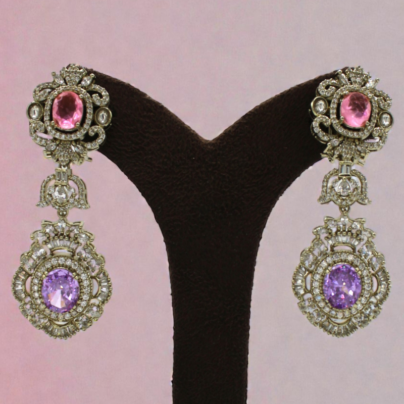 An elegant pair of statement drop earrings featuring a beautifully detailed antique gold framework. The top is adorned with a vibrant blush pink oval stone, while the lower drop showcases a soft lavender oval stone surrounded by intricate crystal embellishments. The vintage-inspired detailing and delicate craftsmanship make these earrings perfect for festive and wedding occasions.