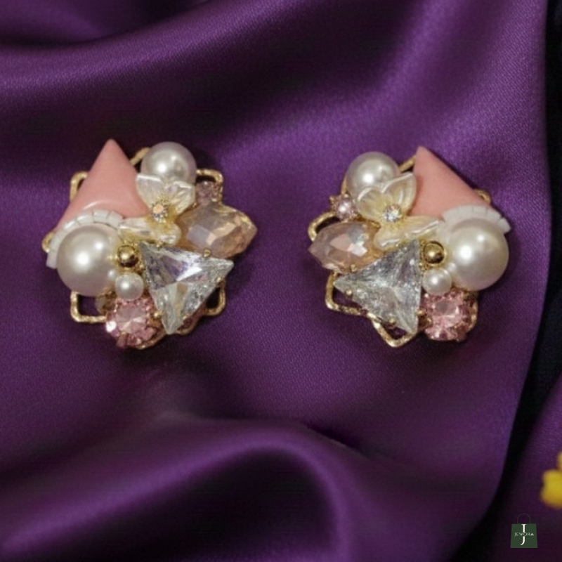 Add a soft feminine charm to your jewellery collection with these beautifully crafted Blush Pearl Bloom Designer Stud Earrings. Designed with a delicate mix of pastel pink enamel, shimmering crystals, and classic pearls, these earrings create a graceful yet statement look. The floral-inspired arrangement with layered textures makes them perfect for festive wear, parties, brunches, and special occasions.