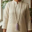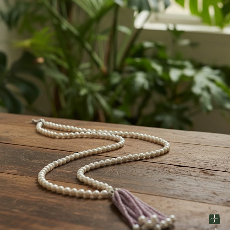 The flowing tassel creates movement and sophistication, while the smooth pearl finish reflects classic refinement. Perfect for festive gatherings, formal occasions, elegant day wear, and modern traditional styling, this necklace blends simplicity with graceful detail.