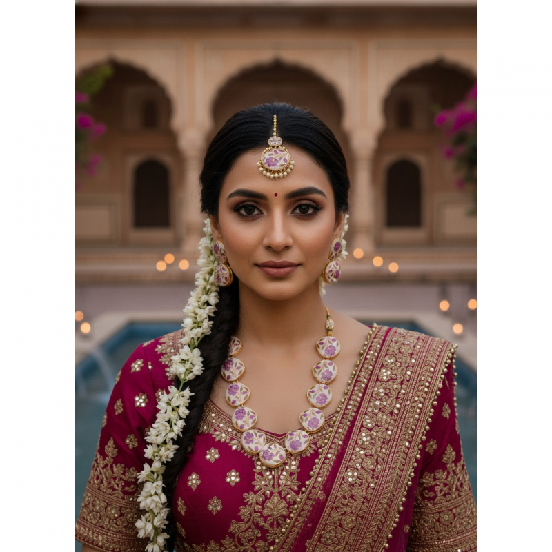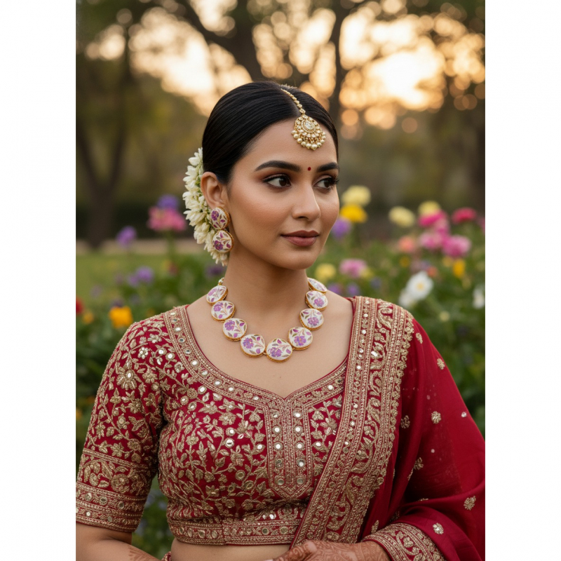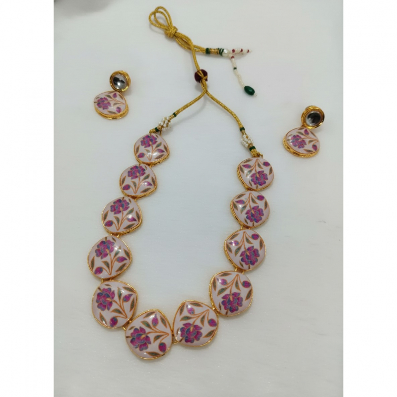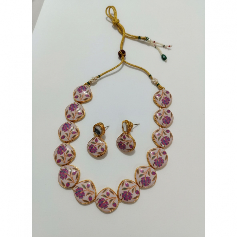 Add a touch of delicate elegance to your ethnic wardrobe with this Blush Petal Enamel Floral Necklace & Earring Set. Featuring beautifully crafted pastel pink enamel tiles adorned with hand-painted floral motifs, this jewelry set blends classic artistry with modern charm.