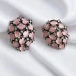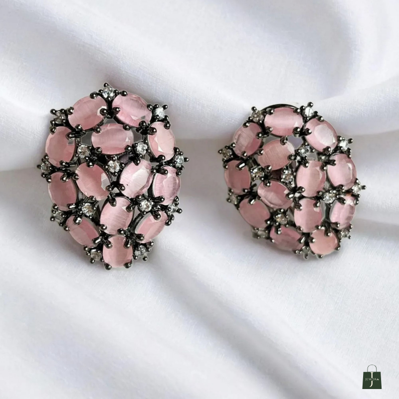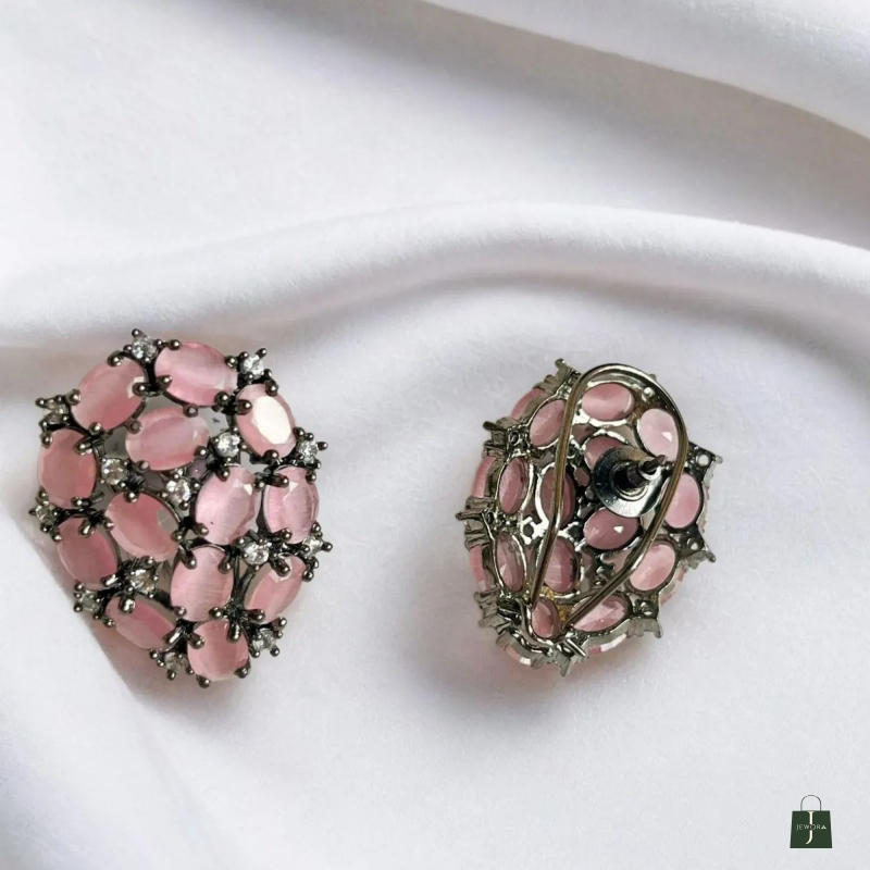 Elegant BLUSH PINK AMERICAN DIAMOND STUD EARRINGS featuring a floral cluster design with soft pink stones and sparkling American diamonds. Perfect for party wear, festive looks, and elegant everyday styling.