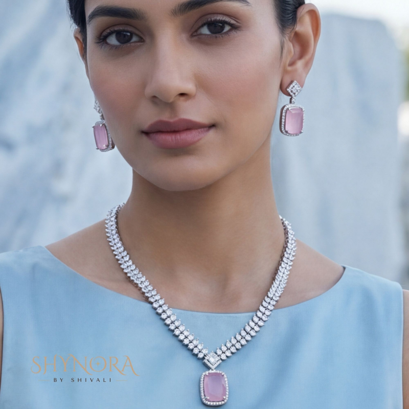Add effortless elegance to your look with this Blush Pink Crystal Pendant Necklace Set, designed with soft pink rectangular stones framed by sparkling clear crystals in a sleek silver-tone finish. The necklace features a refined crystal-linked chain that leads to a graceful pink stone pendant, offering a perfect balance of simplicity and sophistication.