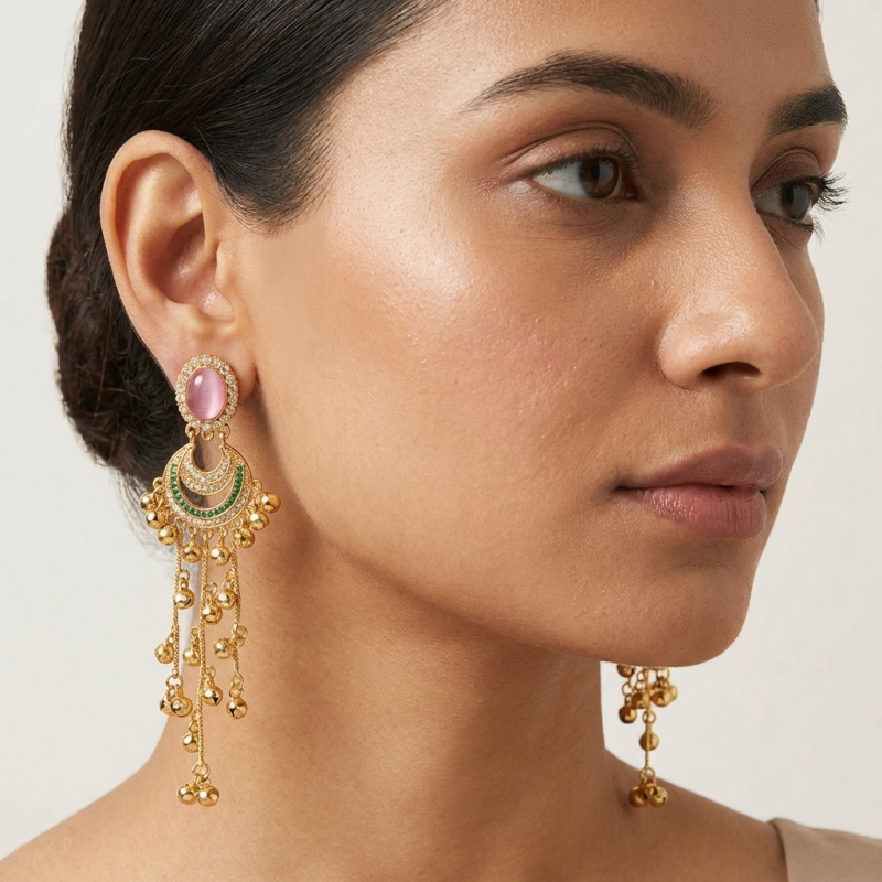 Design Details: The earrings feature a stunning blush pink cat-eye stone centerpiece, elegantly framed by shimmering white crystals. Below hangs a delicate golden crescent (Chandbali), accented with a vibrant row of emerald-green stones for a beautiful color contrast.