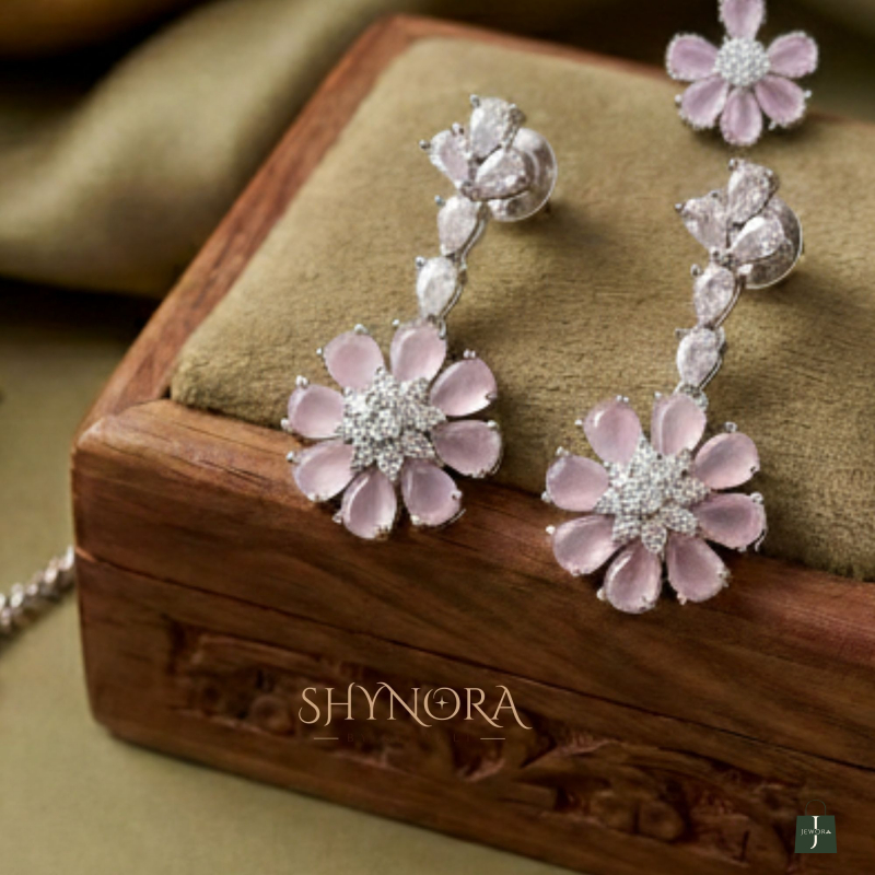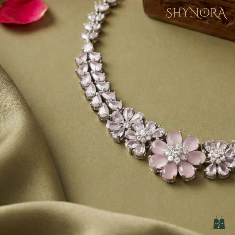 dd soft glamour and feminine charm to your look with this Blush Pink Floral Crystal Necklace Set, beautifully designed for modern brides and festive elegance. Featuring delicate flower motifs crafted with blush pink stones and sparkling crystal accents, this necklace offers a graceful and lightweight silhouette.