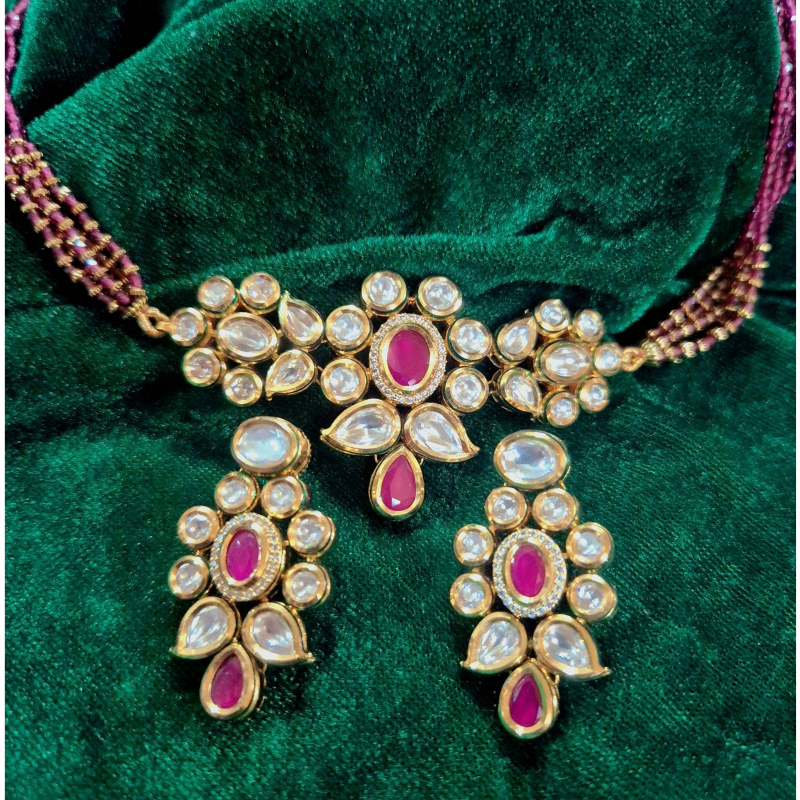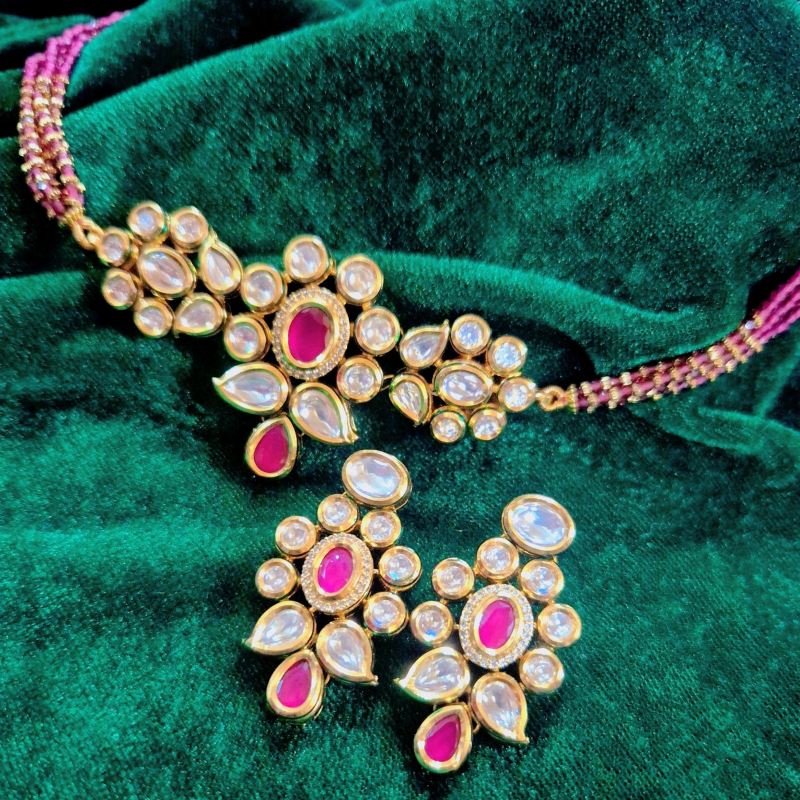 Enhance your elegance with the Blush Polki Beads Royal Necklace Set, a graceful piece inspired by traditional craftsmanship. Designed with a rich gold polish, this set features soft pink polki-style stones that radiate a delicate and feminine charm. The intricate arrangement is beautifully complemented by fine bead detailing, adding depth and a luxurious touch. Paired with matching earrings, it creates a perfectly balanced and sophisticated look. The S-hook clasp closure ensures a secure and comfortable fit. Ideal for weddings, festive occasions, and special events, this necklace set brings a royal and timeless appeal to your overall style.