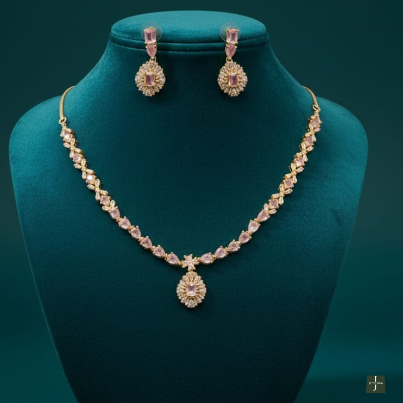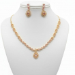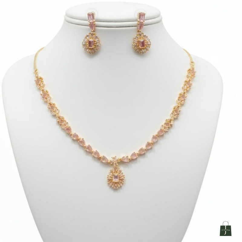 The intricate floral-inspired pendant centerpiece adds depth and sparkle, while the matching drop earrings complete the coordinated look. The combination of soft pink hues and golden detailing creates a timeless and feminine aesthetic.