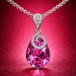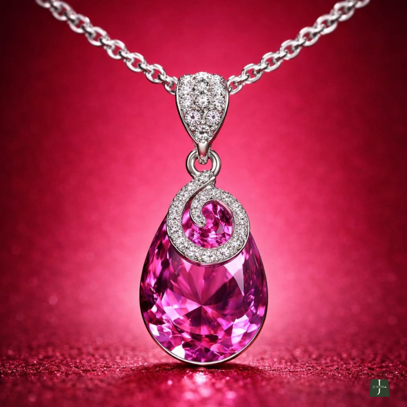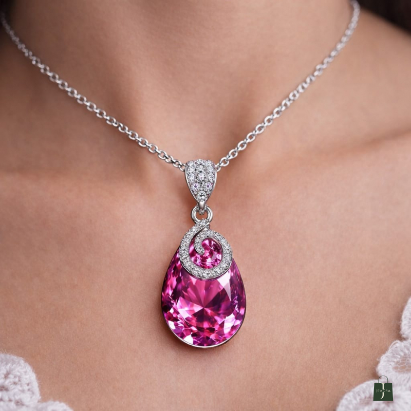 A captivating teardrop-shaped pink gemstone pendant, set in sleek white metal and crowned with a sparkling pavé halo detail. The vibrant blush stone catches the light with every movement, creating a luminous and feminine statement. Suspended from a delicate chain, this elegant piece is perfect for romantic evenings or adding a pop of color to refined everyday style.