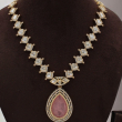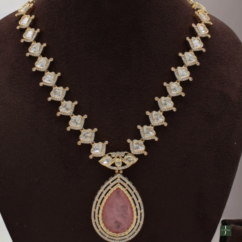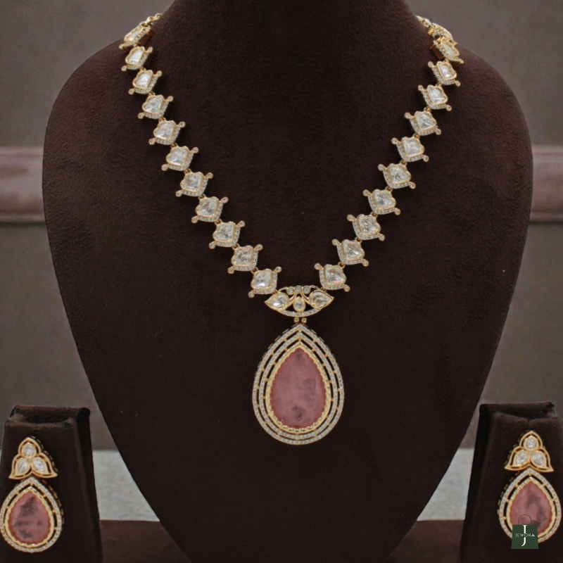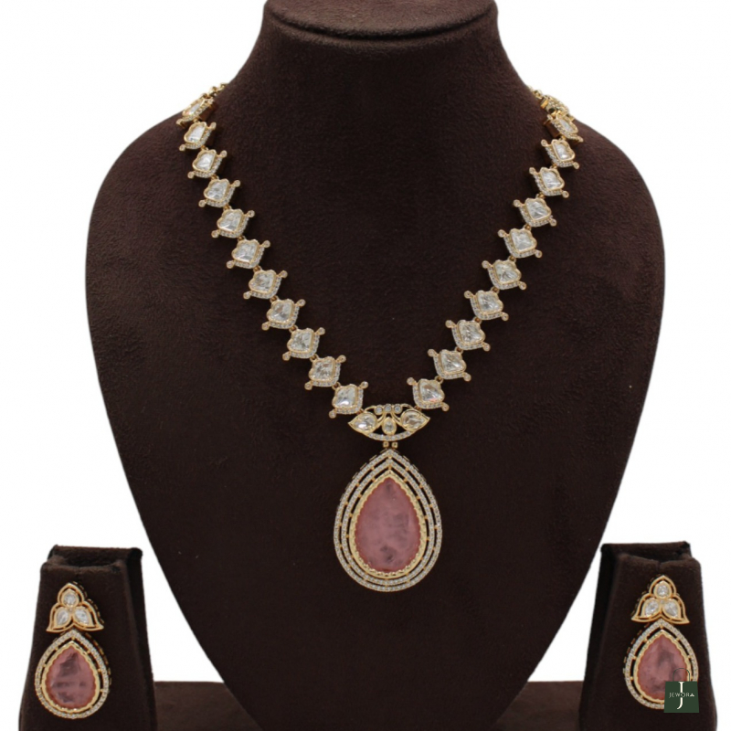 Enhance your look with this beautifully crafted necklace set featuring a soft blush pink teardrop pendant paired with matching earrings. The necklace showcases finely placed square-cut stones linked in a symmetrical pattern, leading to a statement drop pendant framed with delicate detailing. The elegant pink centerpiece adds a sophisticated and feminine charm, making it perfect for weddings, festive occasions, and special celebrations.