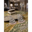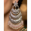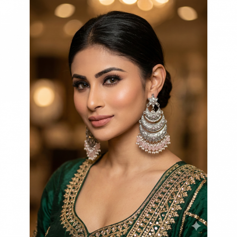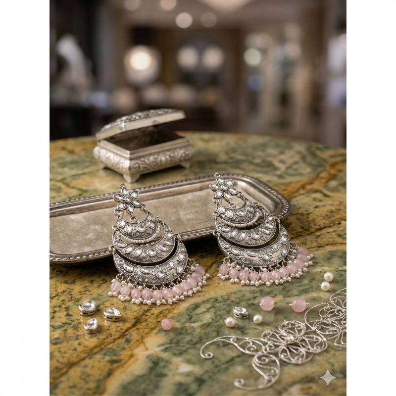Elevate your ethnic wardrobe with our stunning Silver Oxidized Chandbali Earrings. Inspired by celebrity fashion and traditional Indian artistry, these large statement earrings feature intricate floral and crescent moon motifs. Inlaid with radiant clear stones and featuring a beautiful dangle of soft pink beads and pearls, they offer the perfect blend of vintage charm and modern glamour.