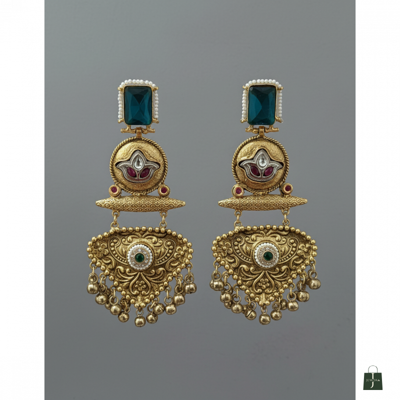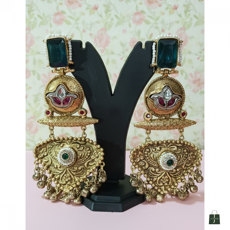 Overall, the earrings have an antique, regal appearance, with detailed craftsmanship and a harmonious mix of gold, teal, red, green, and white accents.