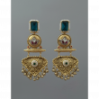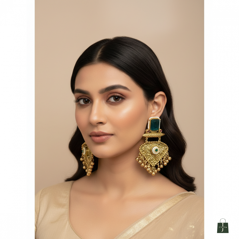 The bottom section is a large fan-shaped gold piece decorated with intricate floral and scroll patterns. In the center sits a small round green stone, surrounded by a ring of tiny white stones. Along the lower edge hang multiple small gold bead drops, giving the earrings movement and a rich, traditional look.