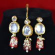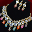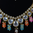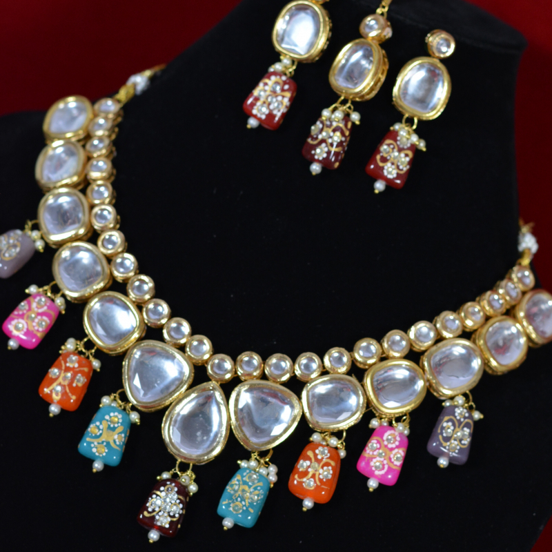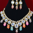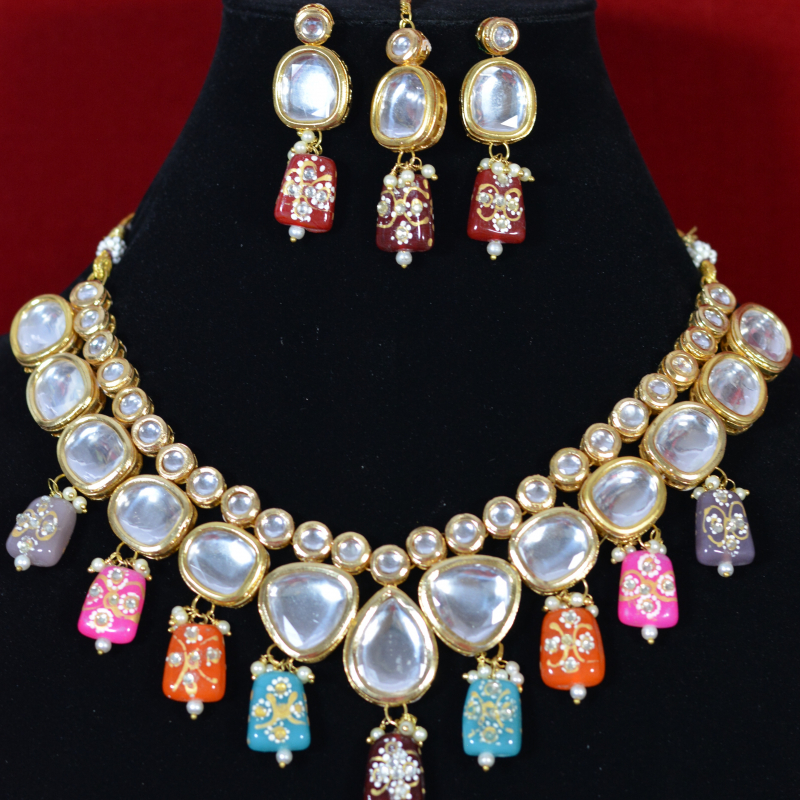 This necklace set features glossy kundan stones bordered with a gold-toned finish, arranged in a balanced, traditional pattern. Multicolored enamel drops in pink, blue, orange, and maroon add artistic charm and visual depth. Fine pearl accents and smooth stone settings enhance the handcrafted appeal, creating a vibrant bridal look that feels rich, festive, and thoughtfully designed.