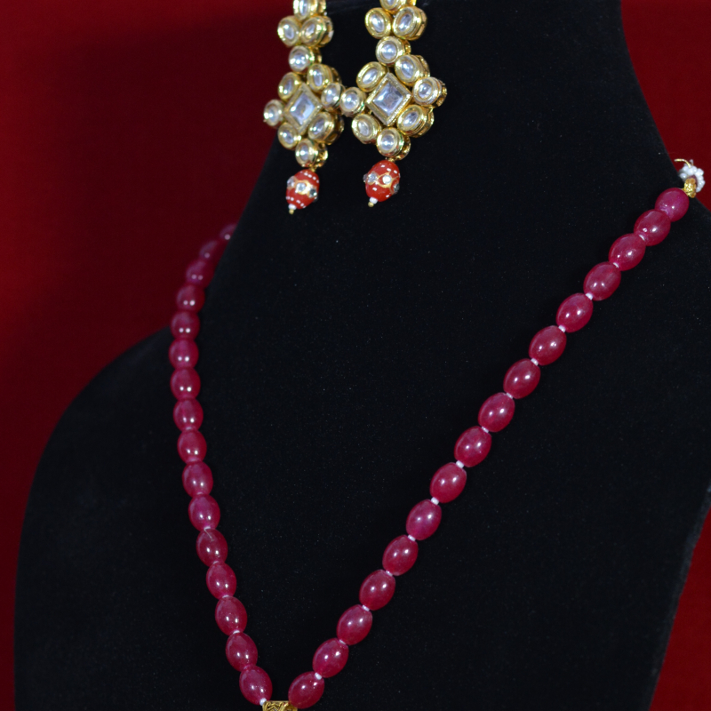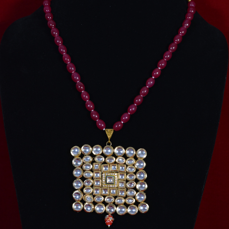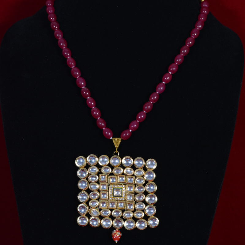 This bridal Kundan necklace set is designed with a rich red bead chain that beautifully complements the intricate square Kundan pendant and matching earrings. The precise stone setting and gold-toned finish create a regal, premium appearance inspired by traditional bridal jewelry. The deep red beads add warmth and contrast, enhancing its festive charm. Ideal for weddings, receptions, and ceremonial occasions, this set delivers a luxurious bridal look while remaining comfortable and thoughtfully affordable.