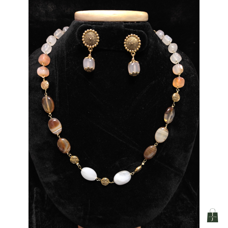 Brown and white colour gemstone necklace with earrings