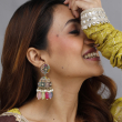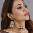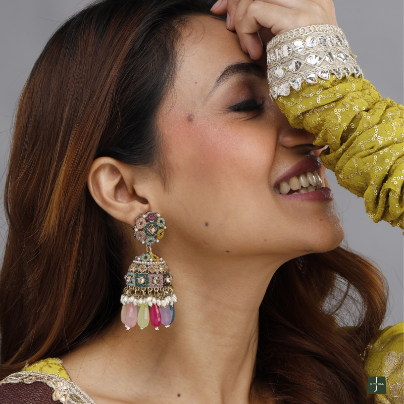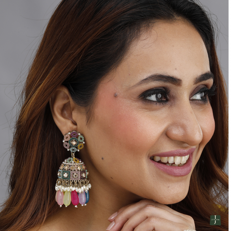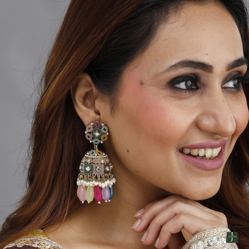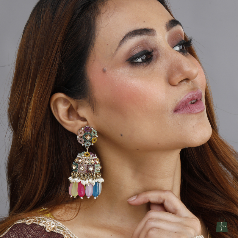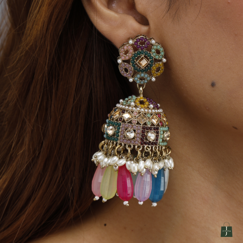 These statement jhumka-style earrings feature a stunning floral stud paired with a beautifully embellished dome, adorned with multi-colored beads, pearls, and intricate mosaic-style patterns.