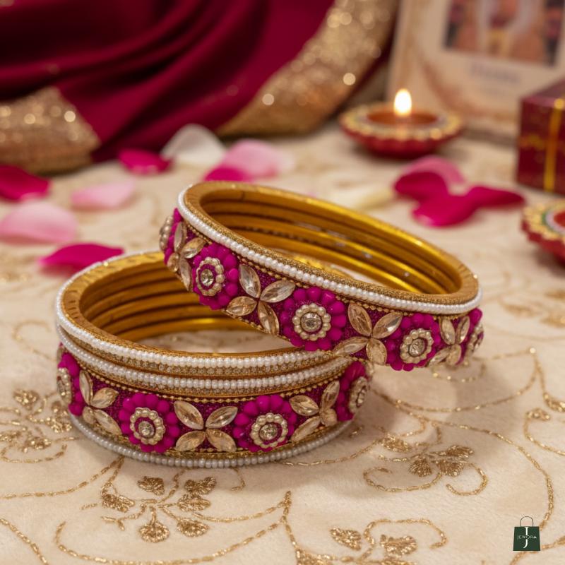 • Rich Colors: A deep  hot pink stones/beads is draped in  the background, contrasting beautifully with the gold and pink of the bangles. This fabric is also embellished with gold sequin work, adding to the richness and texture of the setting.