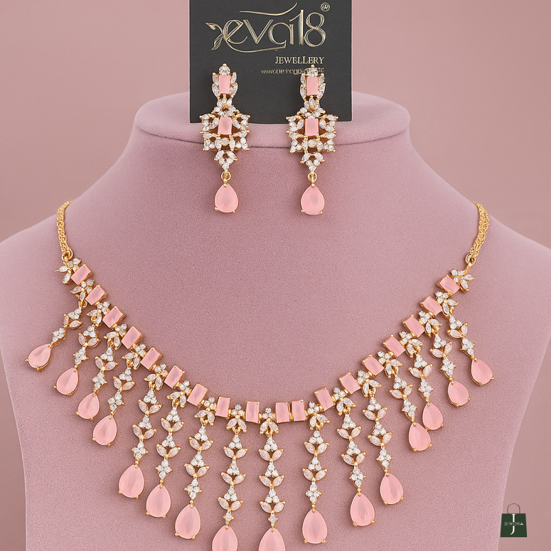 Elevate your festive and bridal look with this dazzling Cascade Glamour Necklace Set. Featuring vibrant ruby-red stones paired with sparkling American Diamonds, this masterpiece is crafted to exude pure luxury. The necklace is designed in an elegant fringe style with cascading pear-cut ruby drops, interlinked with shimmering white stones, creating a waterfall-like brilliance. The matching earrings echo the grandeur with ruby accents and intricate detailing, making them perfect for weddings, receptions, and high-society gatherings. This set blends modern craftsmanship with a regal finish, ensuring you turn heads wherever you go. Whether worn with a silk saree or a designer lehenga, this set becomes the ultimate statement piece in your jewelry collection.