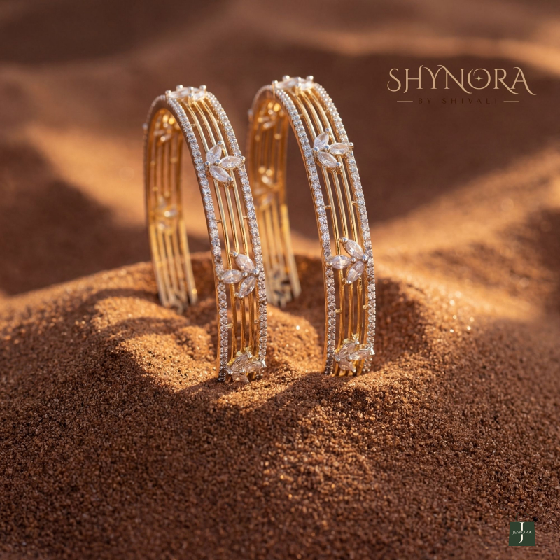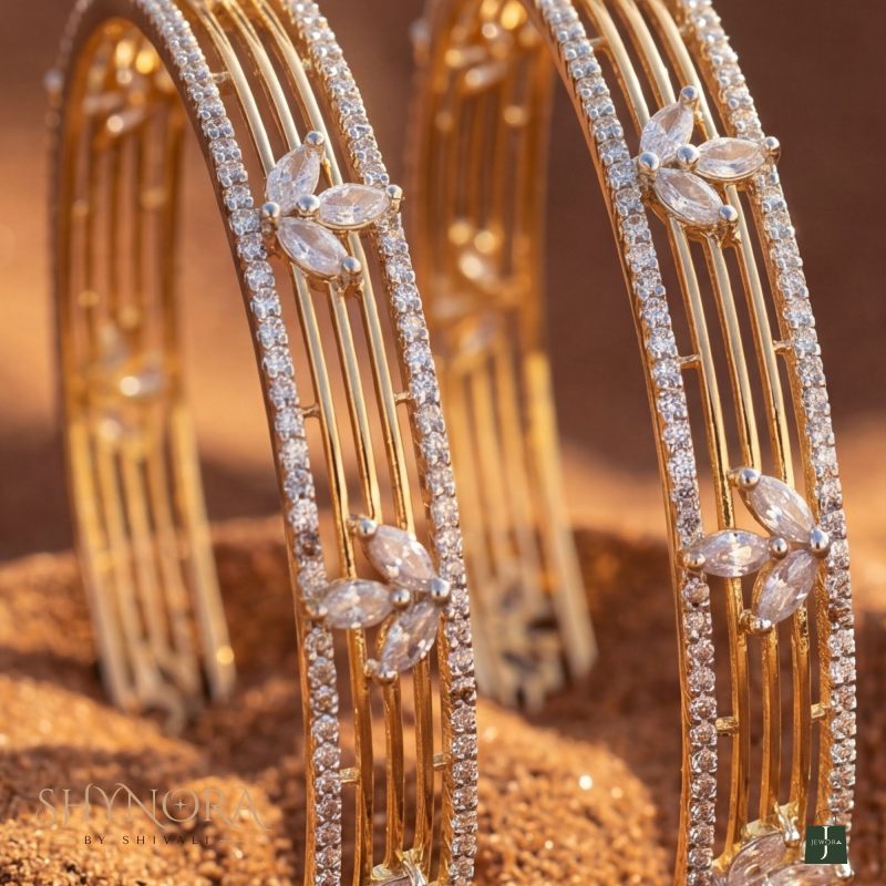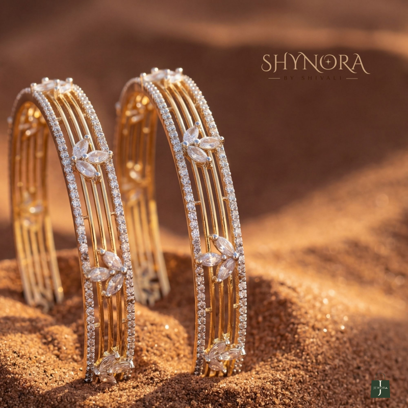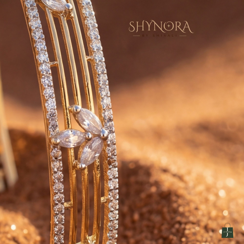 The Celestia Bloom Crystal Bracelets are a refined expression of elegance and modern artistry. Designed with sleek vertical gold bars, these bracelets are beautifully highlighted by delicate floral motifs crafted from marquise-cut diamond-look crystals. A shimmering crystal border frames the design, adding a graceful brilliance with every movement.