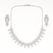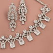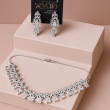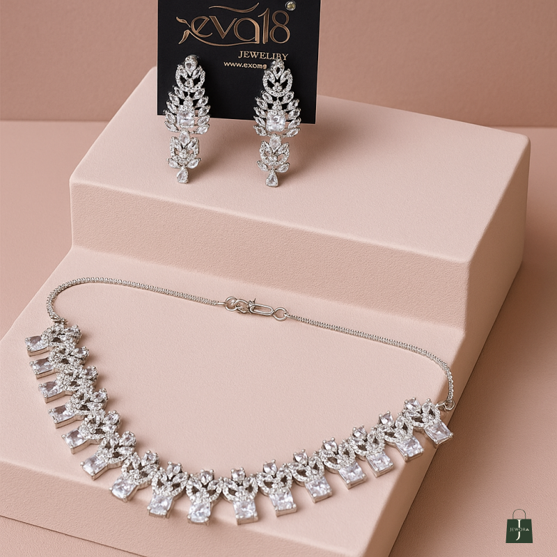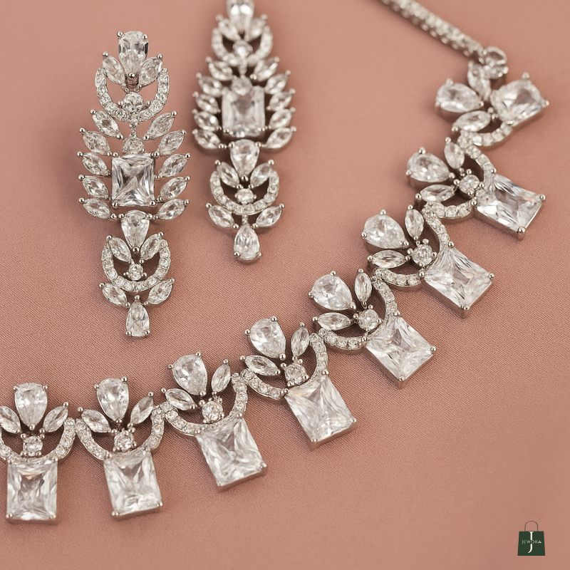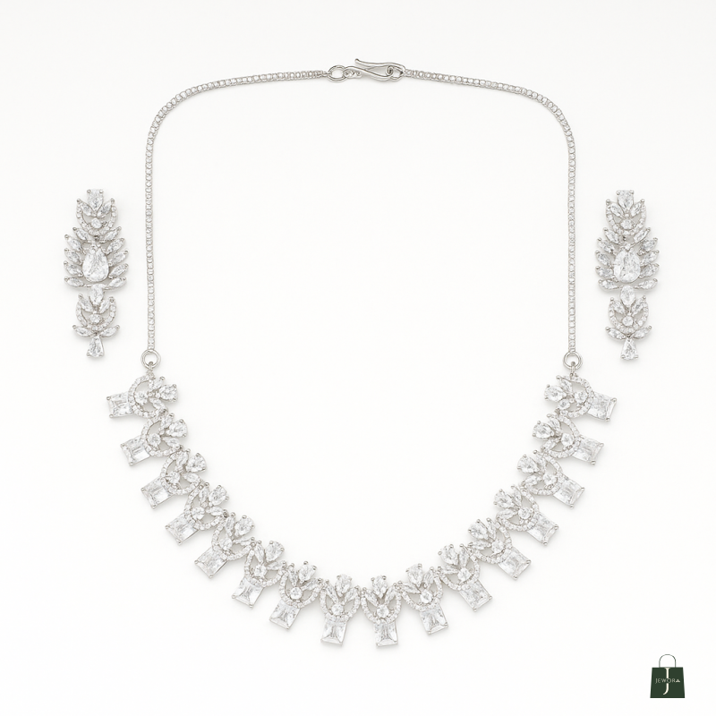 The Celestia Cascade Necklace Set is a striking piece that radiates elegance and modern sophistication. Featuring dazzling clear American Diamond (CZ) stones cut in unique geometric patterns, this necklace gracefully flows along the neckline, resembling cascading drops of light. The fine silver-toned base enhances the brilliance of each stone, ensuring an icy sparkle from every angle. Matching earrings complete the set, showcasing a statement-making leafy design with precision-cut embellishments that shimmer like starlight.